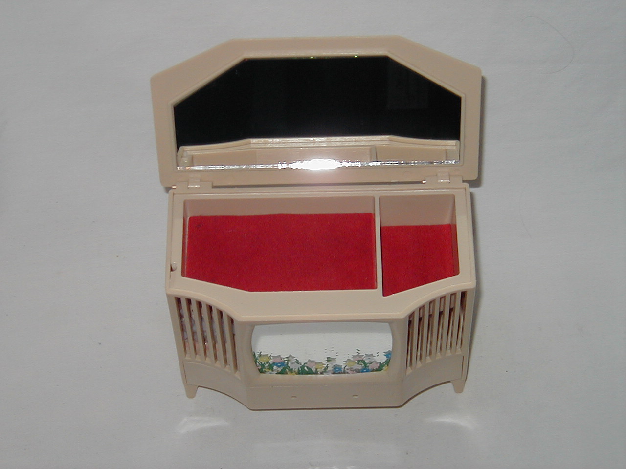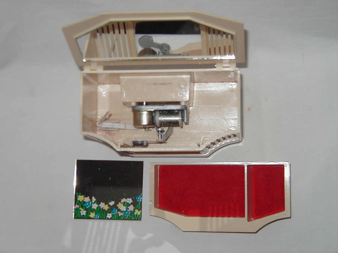 Cream plastic, glass for mirror and screen, cloth bottom tray. |