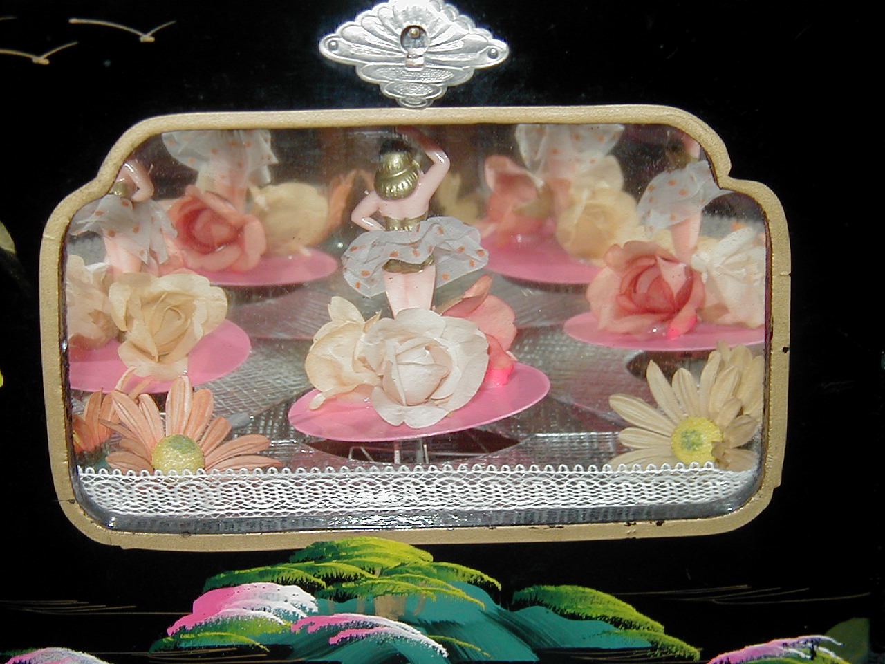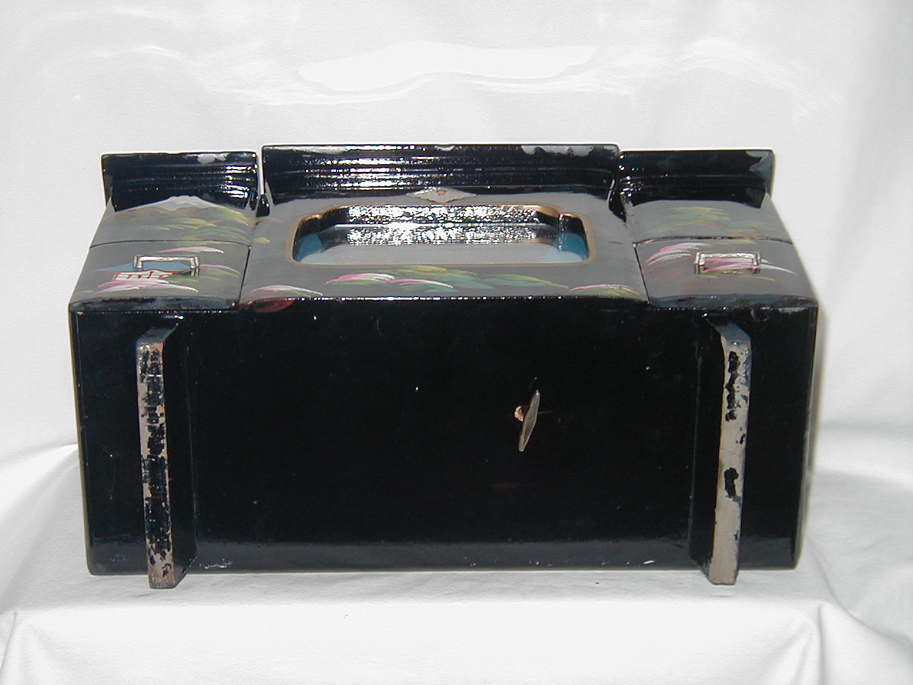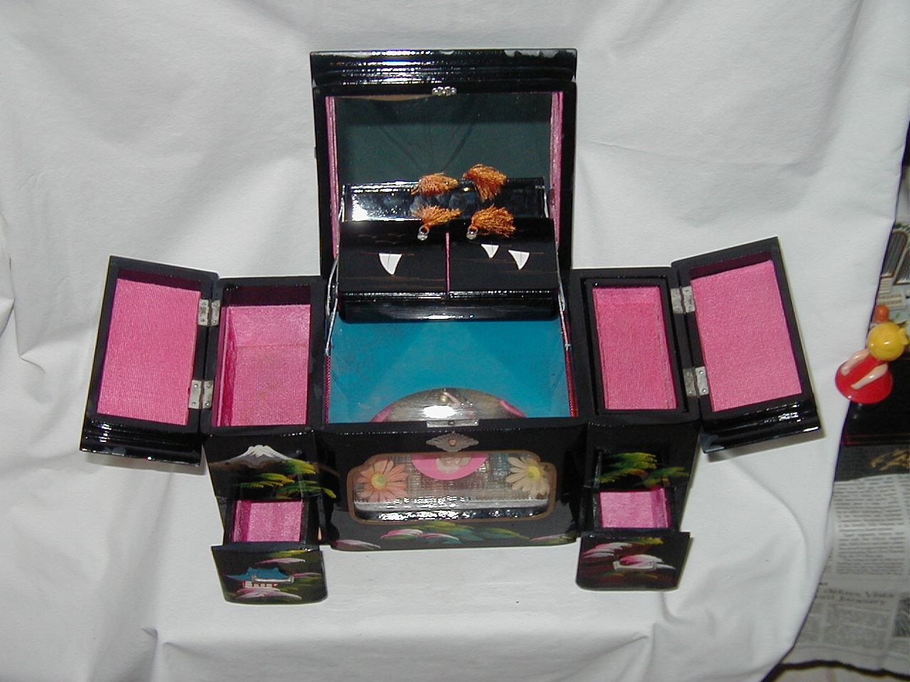 This is a huge chest with the middle roof swinging backward and the 2 side swinging resp to the left and right. The open middle roof shows another inside box with 2 lids and movable. The chest has in addition 2 drawers. The compartment under the right roof has a tray which can be taken out. Under that tray there seems to have been a compartment for batteries to light up the scene in the middle, i suppose, but all that has been taken out by an earlier owner and electric cables partyly cut. The middle part show 3 ballerina's, all three rotating with the music. With the mirrors in the back it seems that there are 5 ballerina's dancing! The key to lock the middle roof is not available. The japanese scenes on the front and 2 sides are really well done. The music mechanism is not open to inspection, but from the key suspect it to be Fuji.