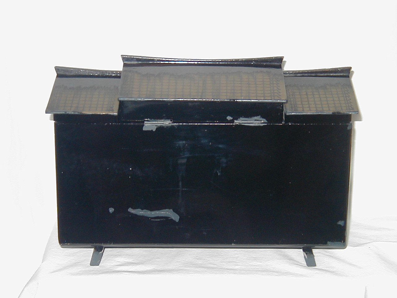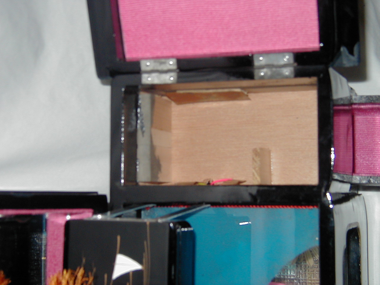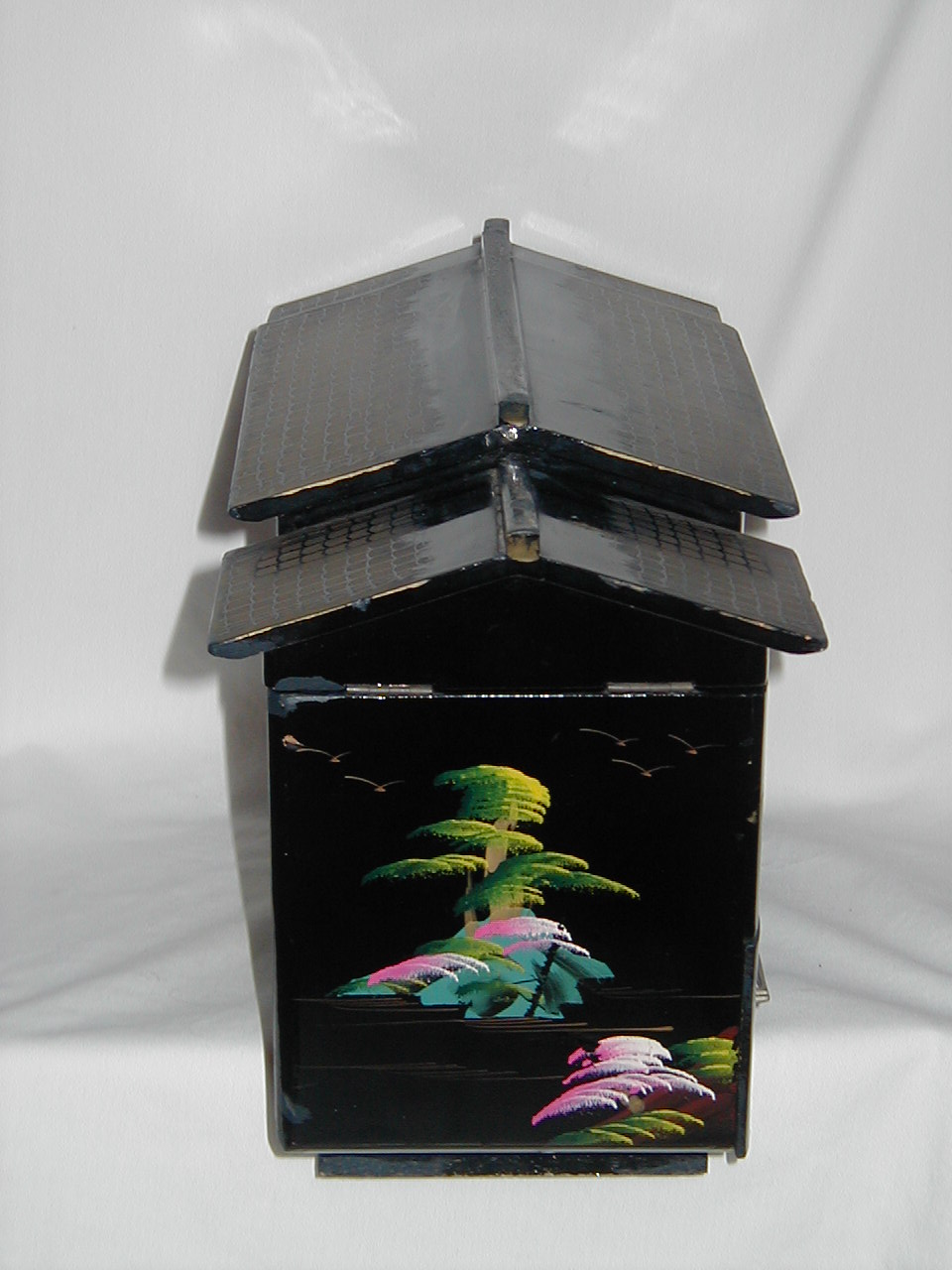 This is a huge chest with the middle roof swinging backward and the 2 side swinging resp to the left and right. The open middle roof shows another inside box with 2 lids and movable. The chest has in addition 2 drawers. The compartment under the right roof has a tray which can be taken out. Under that tray there seems to have been a compartment for batteries to light up the scene in the middle, i suppose, but all that has been taken out by an earlier owner and electric cables partyly cut. The middle part show 3 ballerina's, all three rotating with the music. With the mirrors in the back it seems that there are 5 ballerina's dancing! The key to lock the middle roof is not available. The japanese scenes on the front and 2 sides are really well done. The music mechanism is not open to inspection, but from the key suspect it to be Fuji.