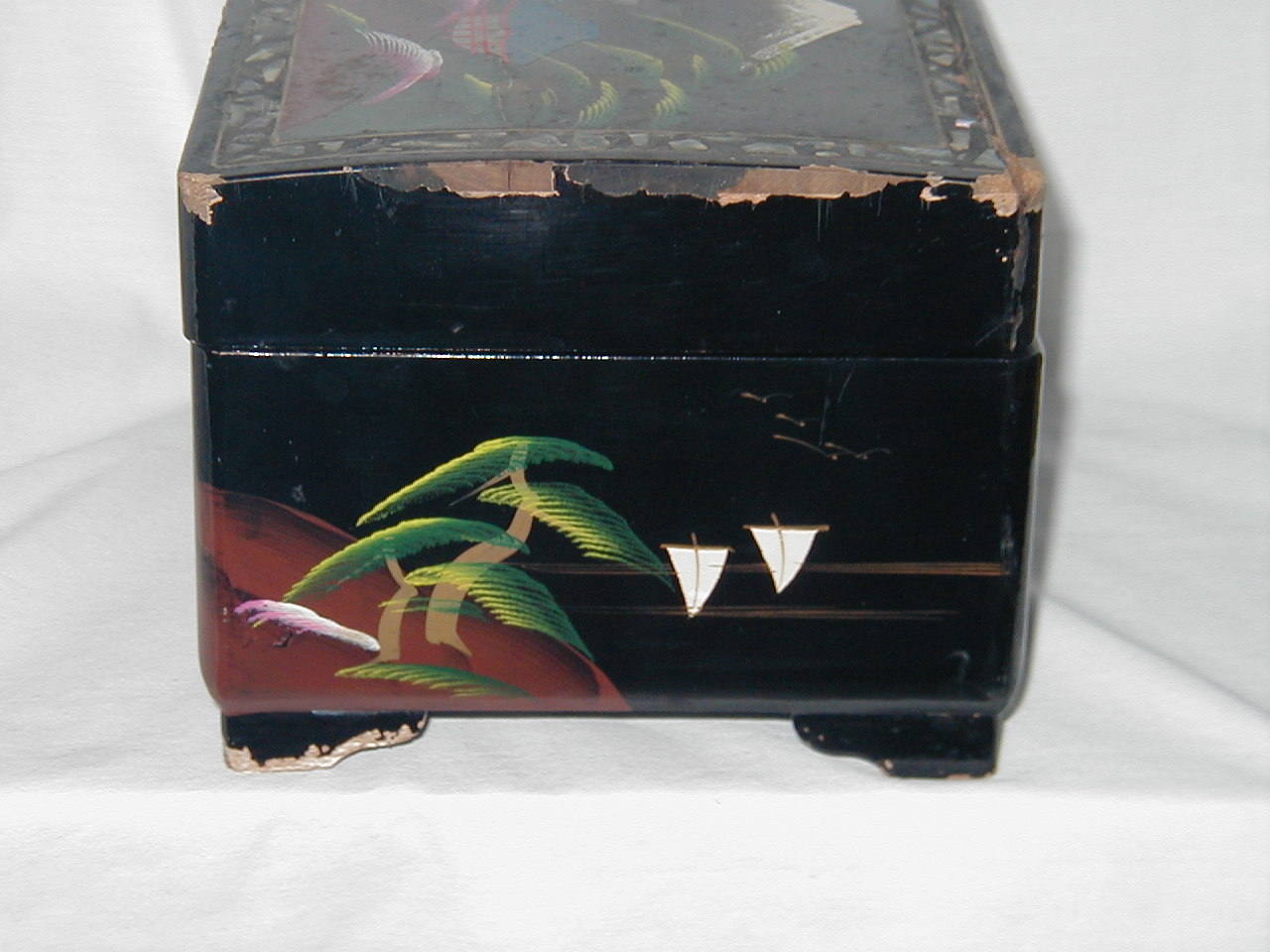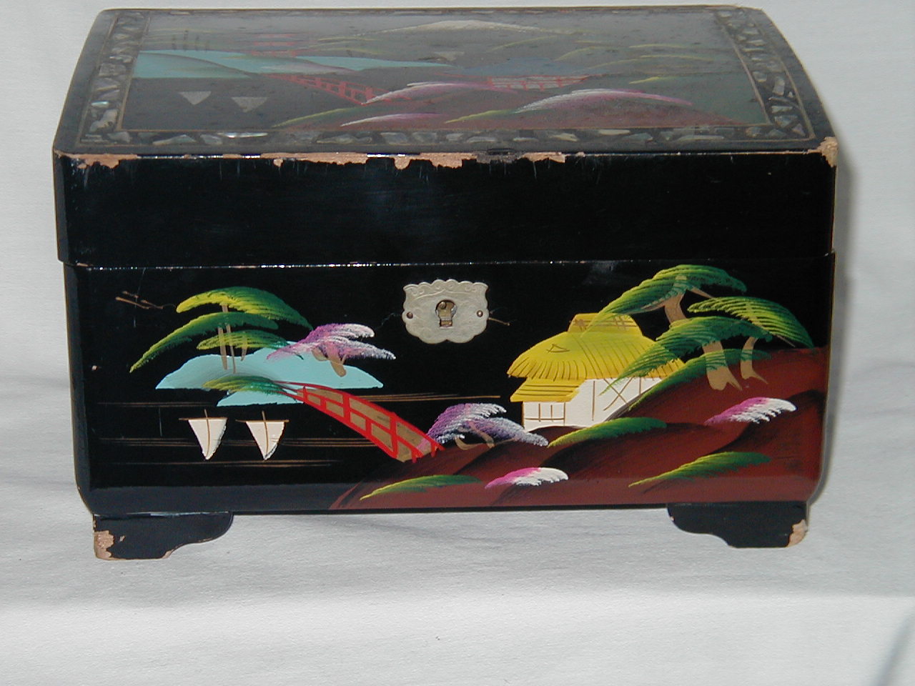 Minor, 2 teeth missing, edges lacquerware severly damaged, no key lock. |