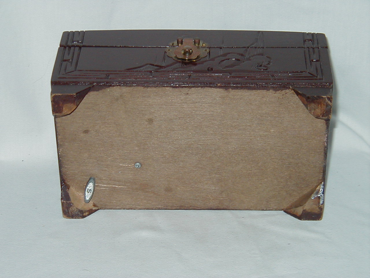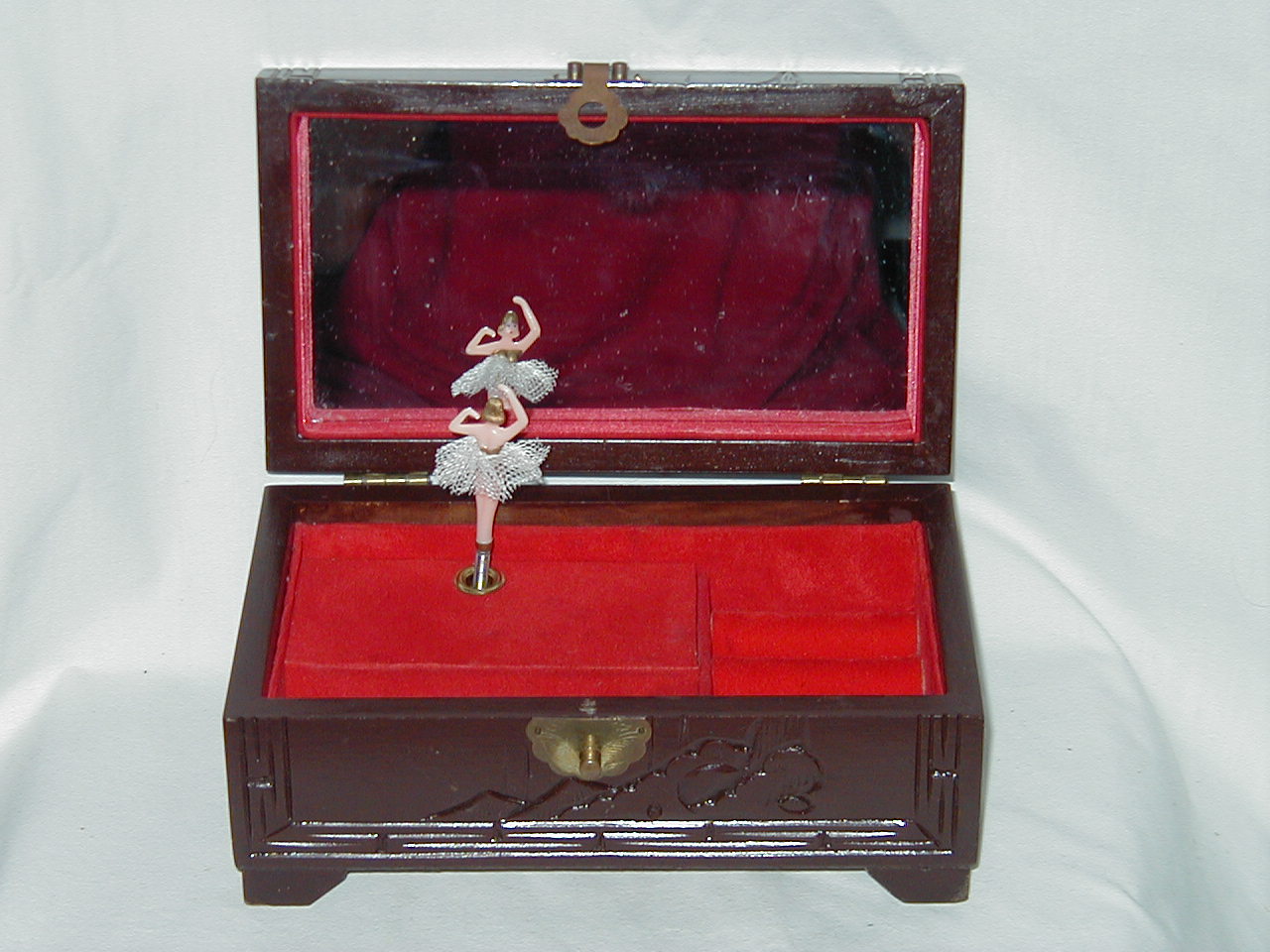 Inside Ballerina rotates when music plays. When lis is closed, ballerina on spring folds within. |