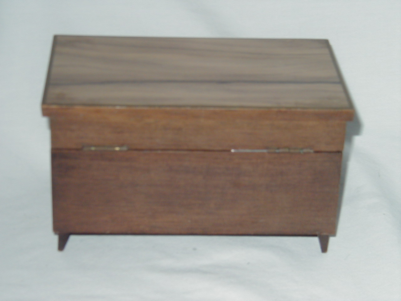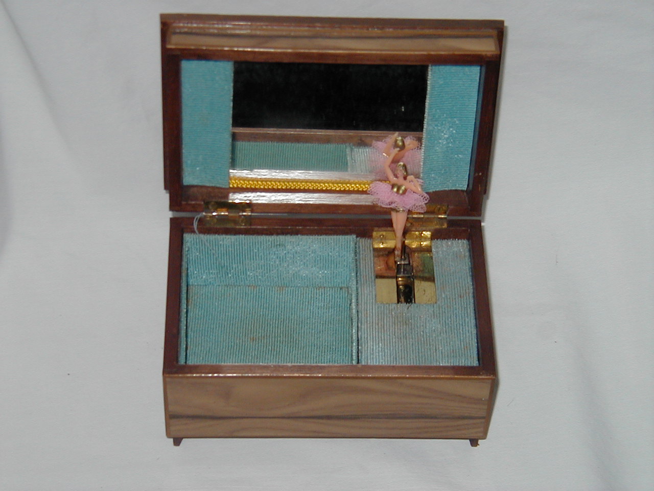 Medium, feet ballerina partly broken off, pin on left hinge missing. |