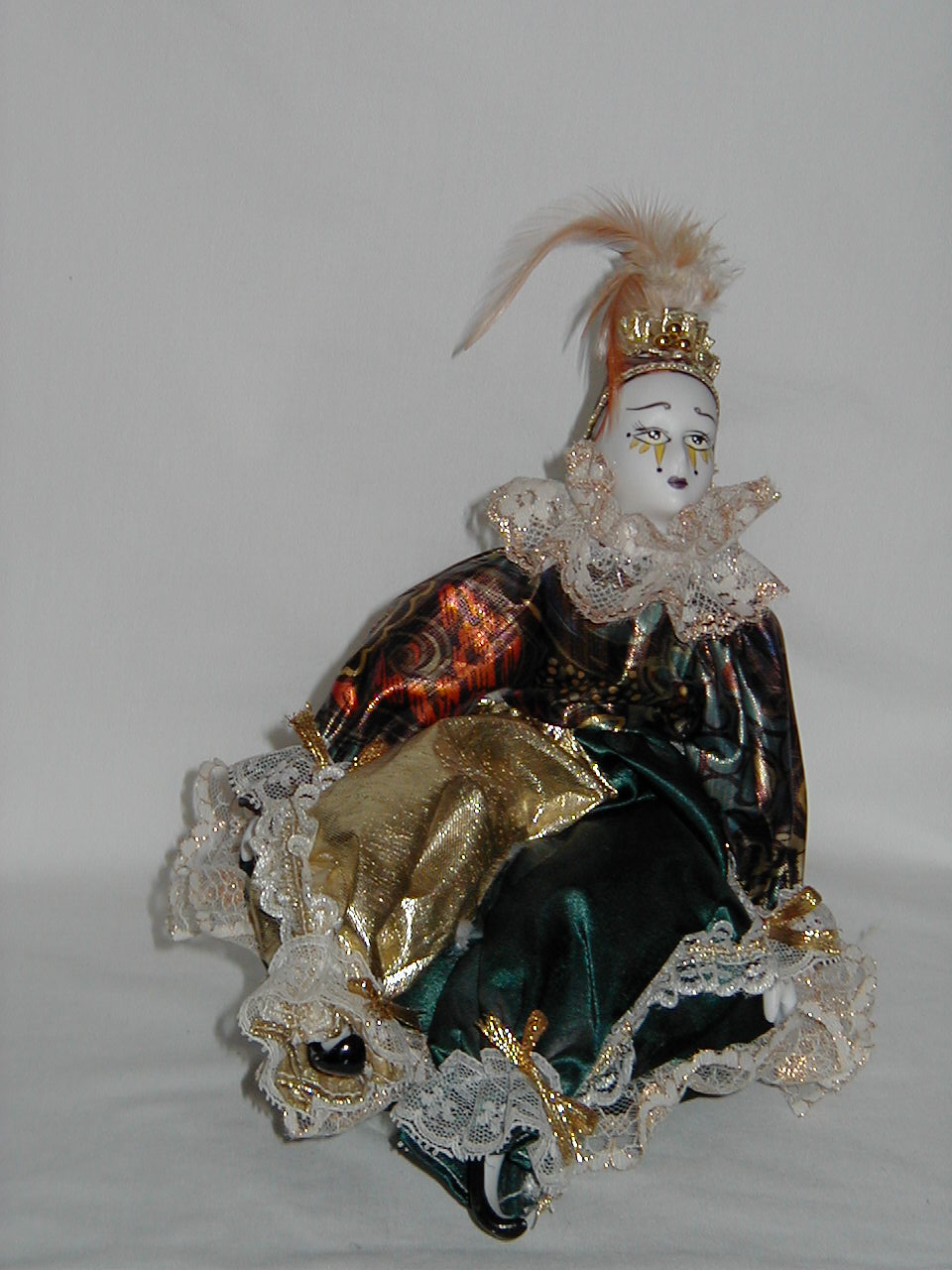 Carnival Lady in Green and Gold with Feathers on Cushion