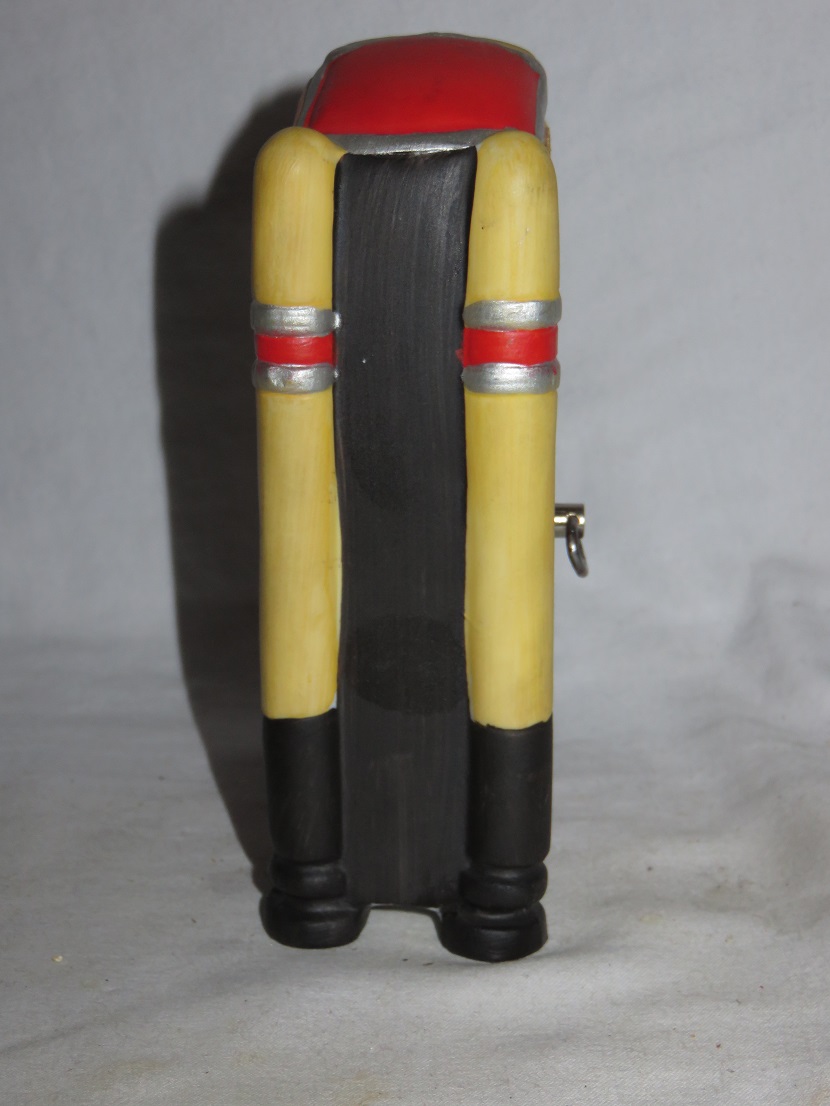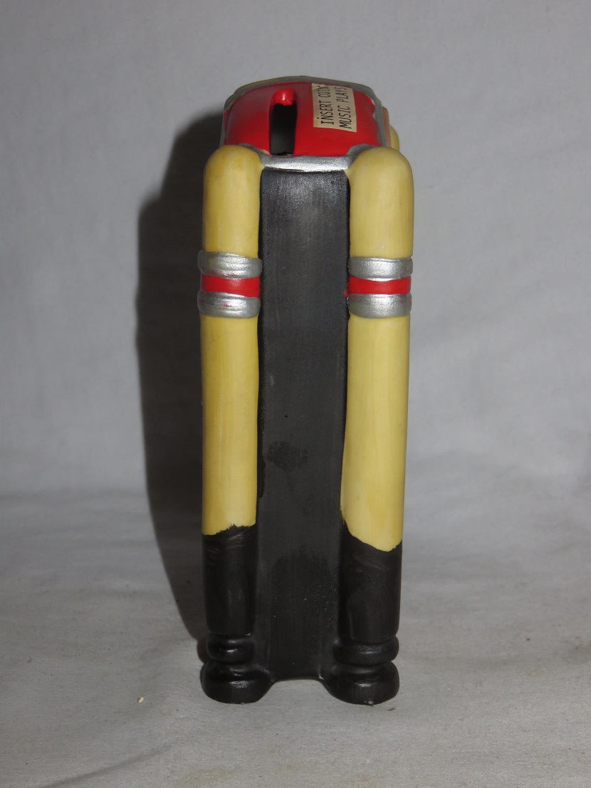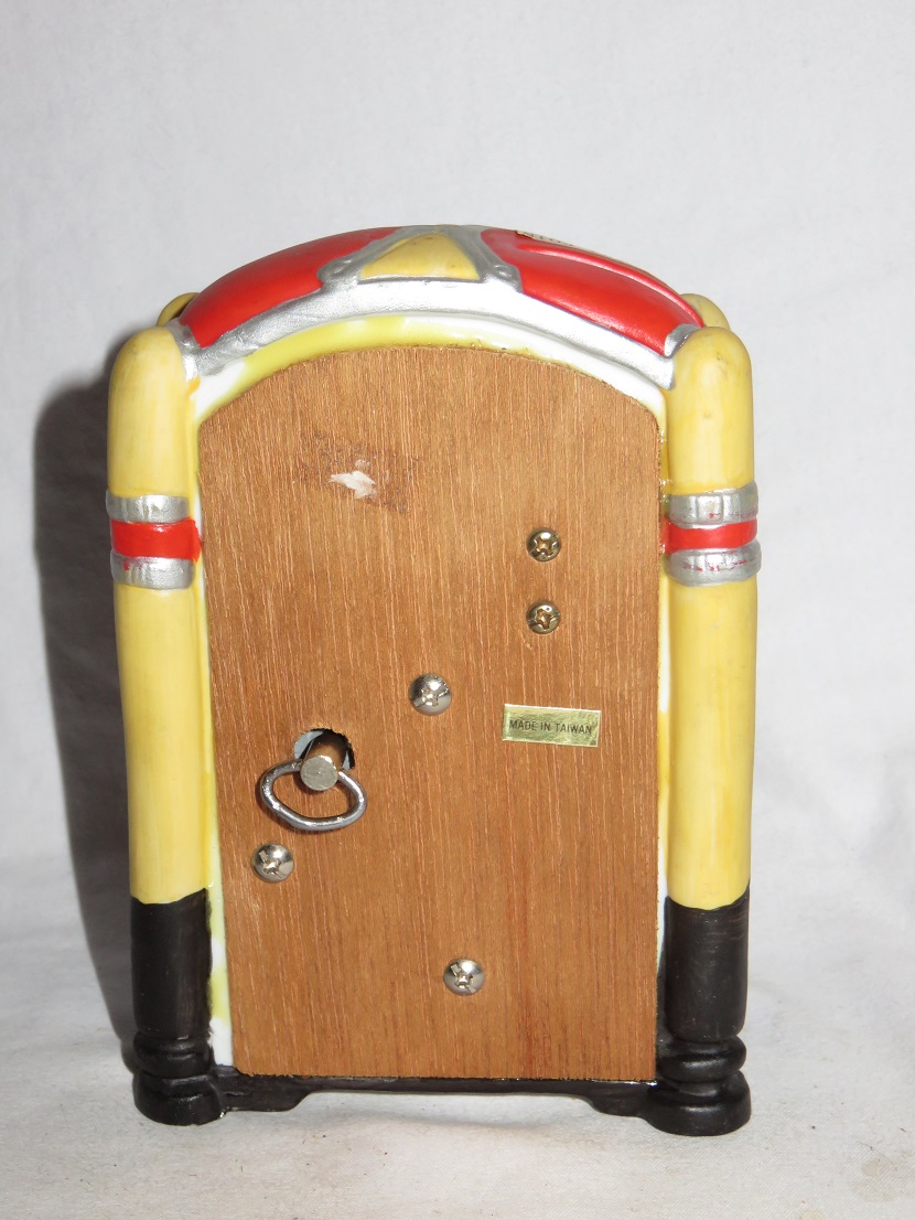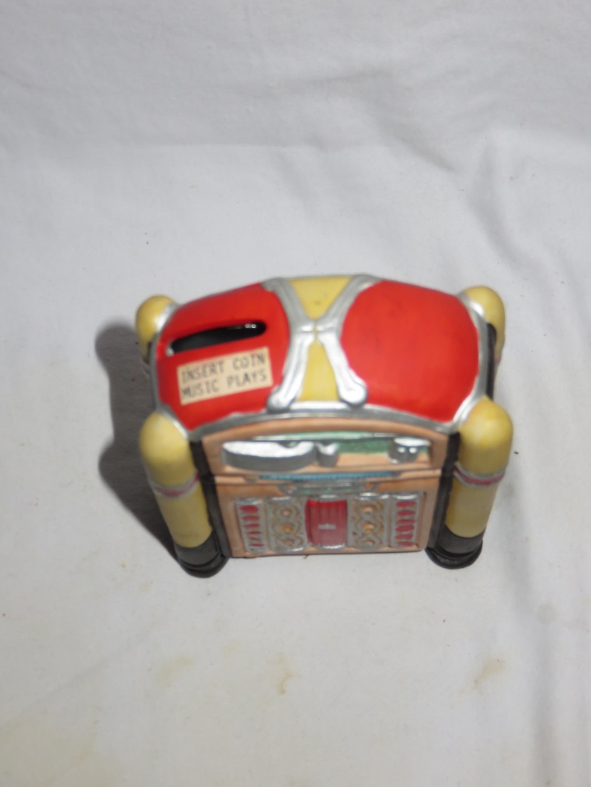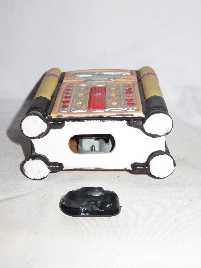 It is a bank, as coins can be deposited via the hole in the top and retrieved via the hole in the bottom, Dropping in a coin depresses a lever that frees the music mechanism and, provided the music mechanism has been wound, plays the music. The music plays for approx. 15 seconds. The lever then slides back into a hole in the back of the rotating wheel near the spring and stops the wheel and the music, till the next coin is dropped.