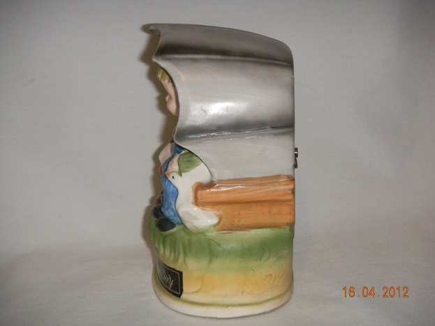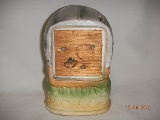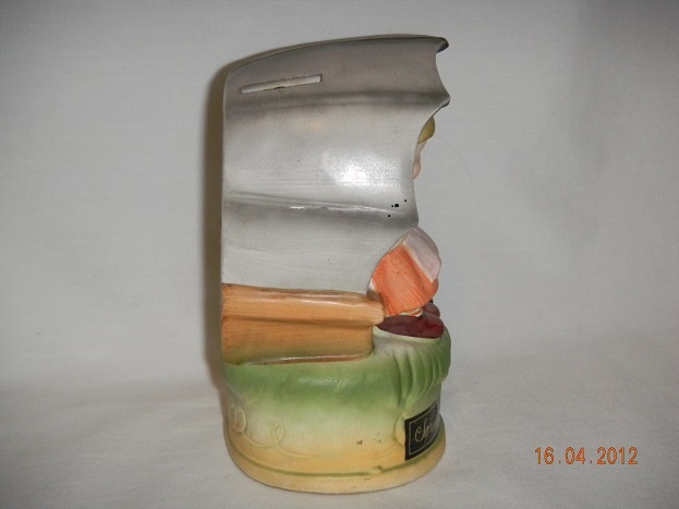 Medium, chip from umbrella, recolored black. Most likely had un inside mechanism that when you threw money in the opening, started to p[lay the tune, all gone. Wood cover in back reglued. |
