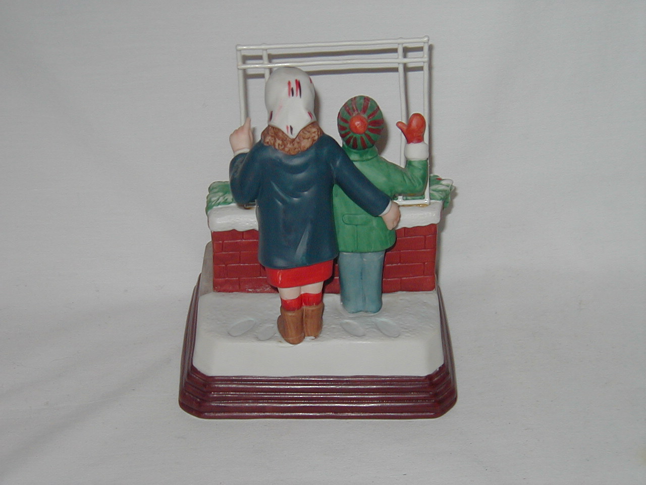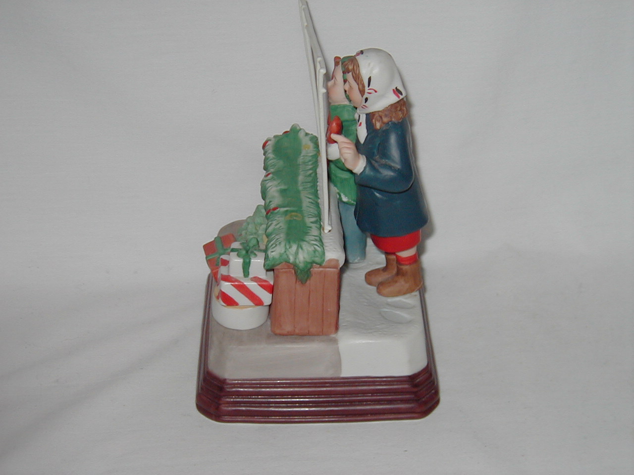 Minor, boy broken in half and reglued. Also, most likely there were gifts/toys on upper shelf against window. |