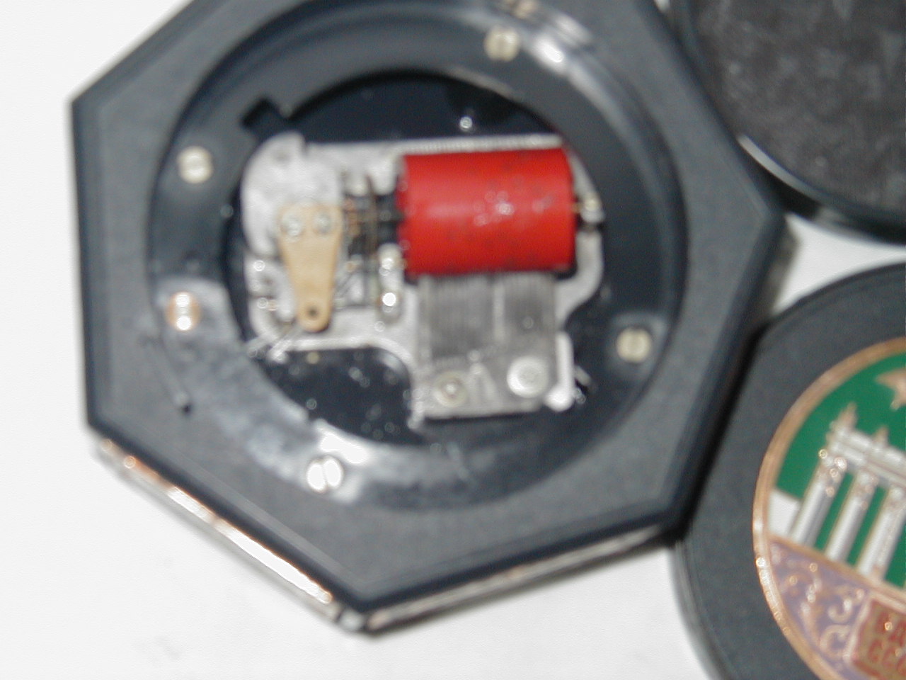 Yes, plastic pin under rim lid, music plays when lid is lifted. |