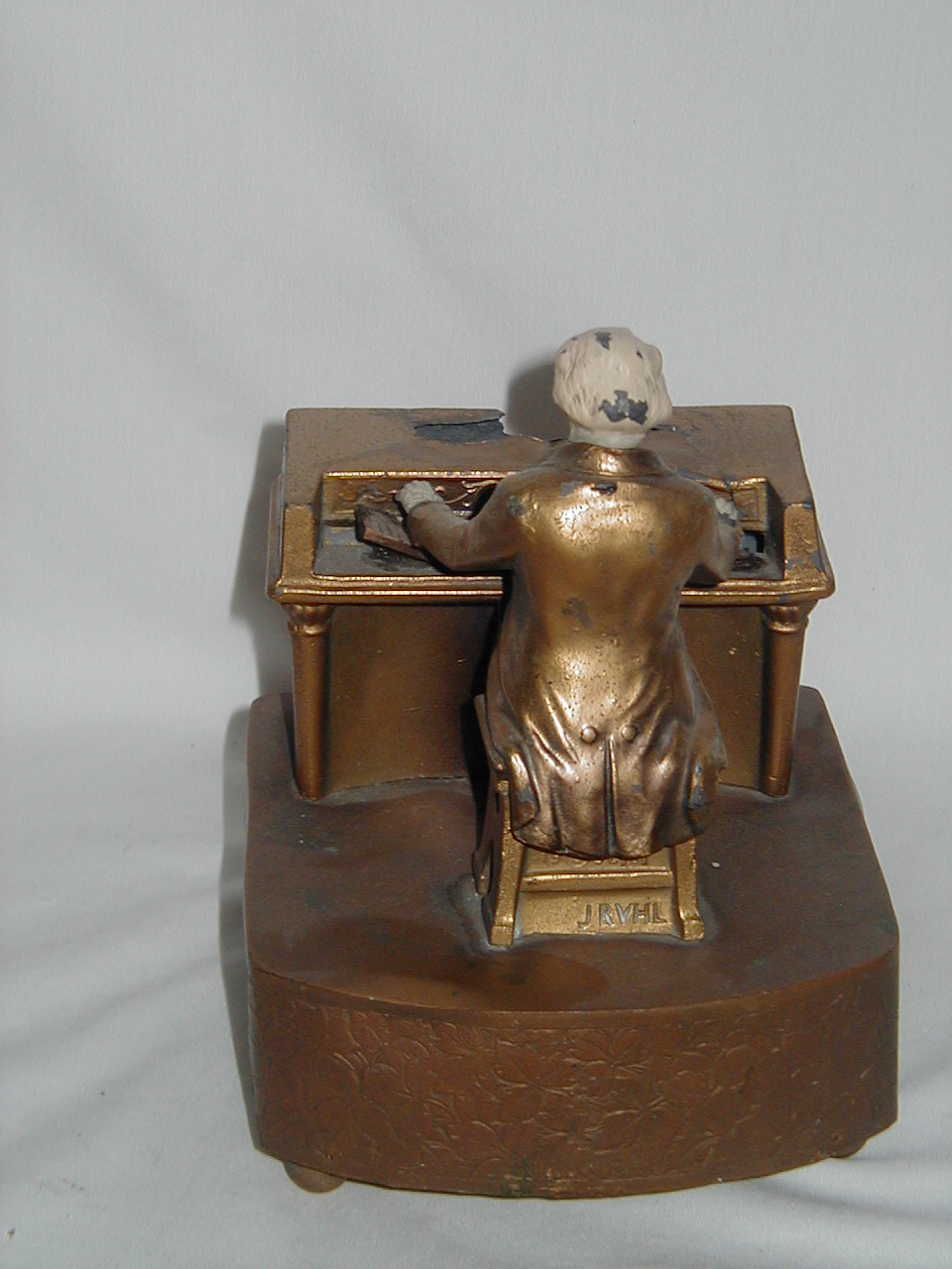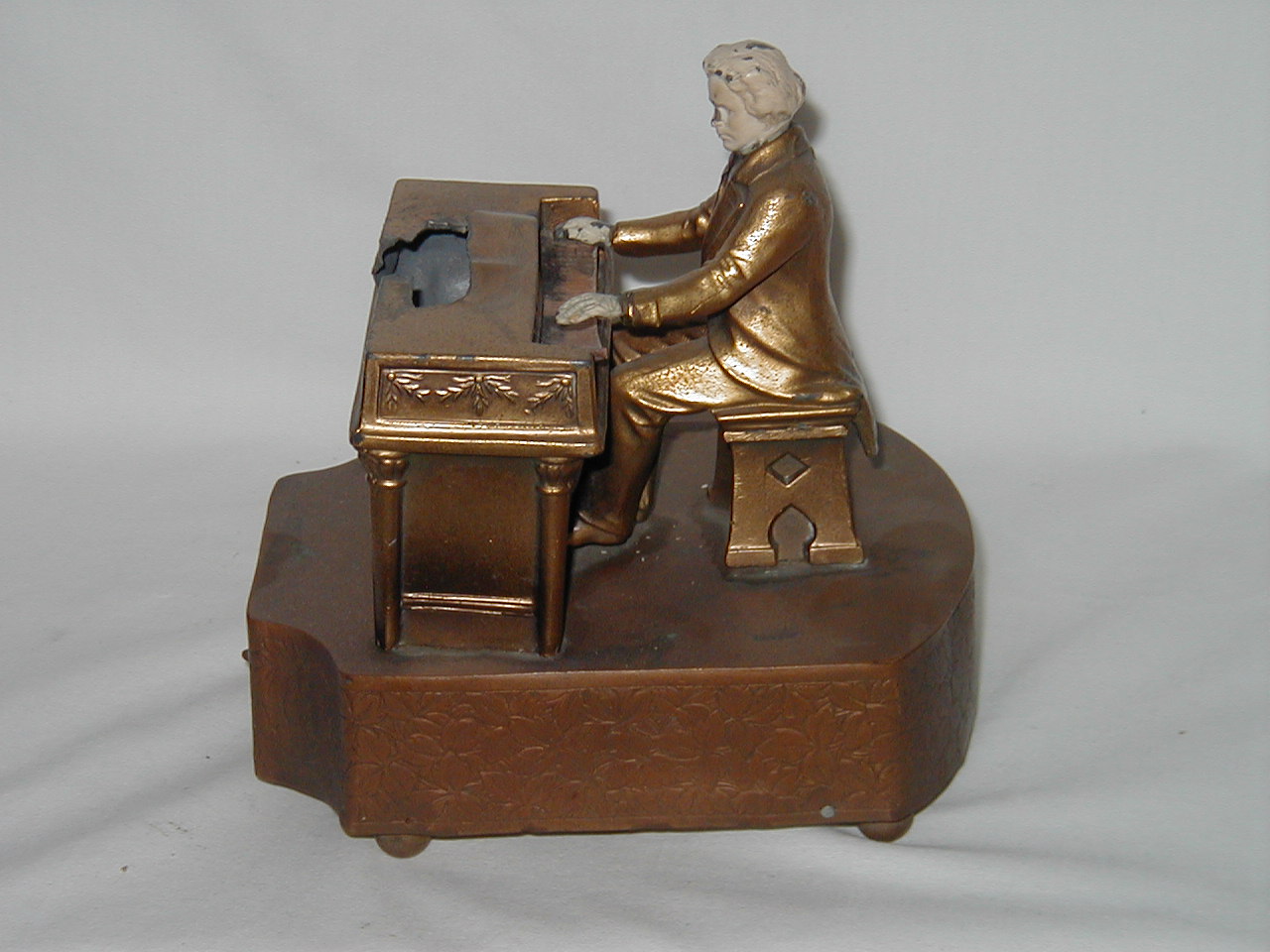 In checking the internet, found an identical, though with a different man face, box offered for sale end December 2006. It was suggested that it was one part of a bookend, but do not believe that to be true. My guess, and no more, is that it might have been a series of composers like Bach etc. Regretfully can not name the tune, as that might have helped. On the top of the piano a piano standard with pianobook is missing. Also the keyboard has curled up on both ends, looks like an early plastic. No moving parts and none intended as far as i can see.. Music works fine, as well as on/off switch.