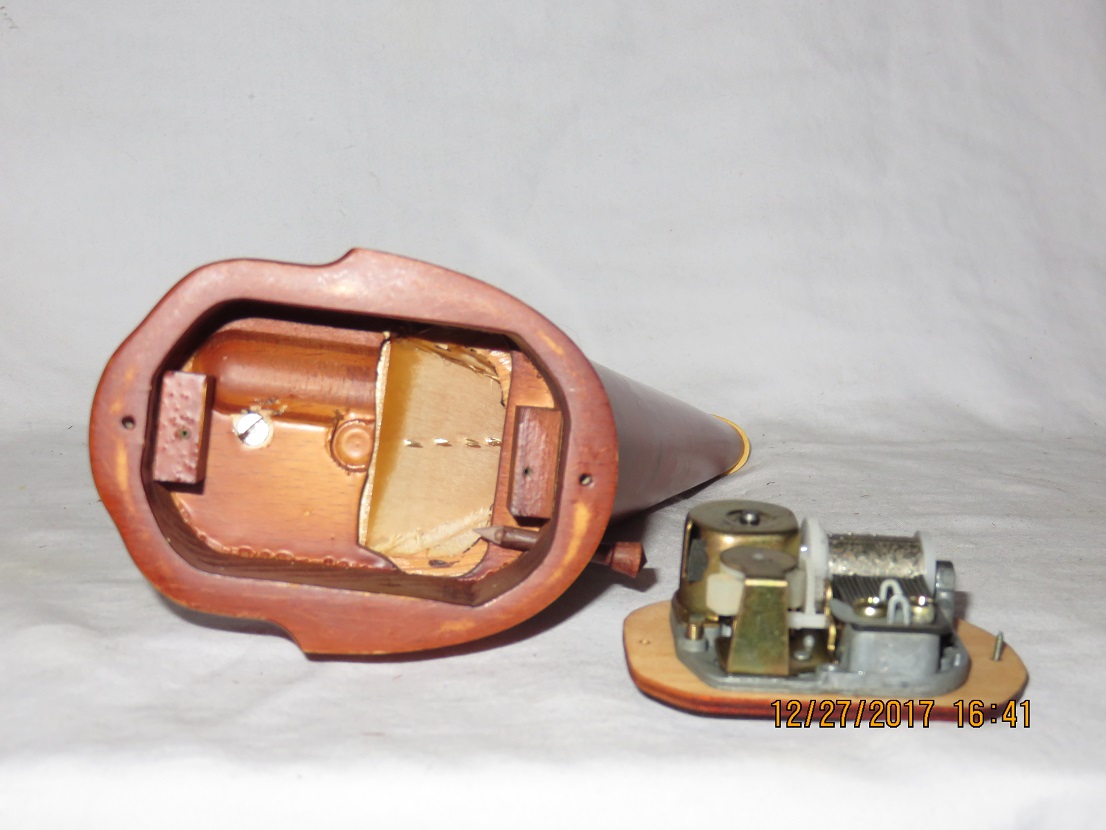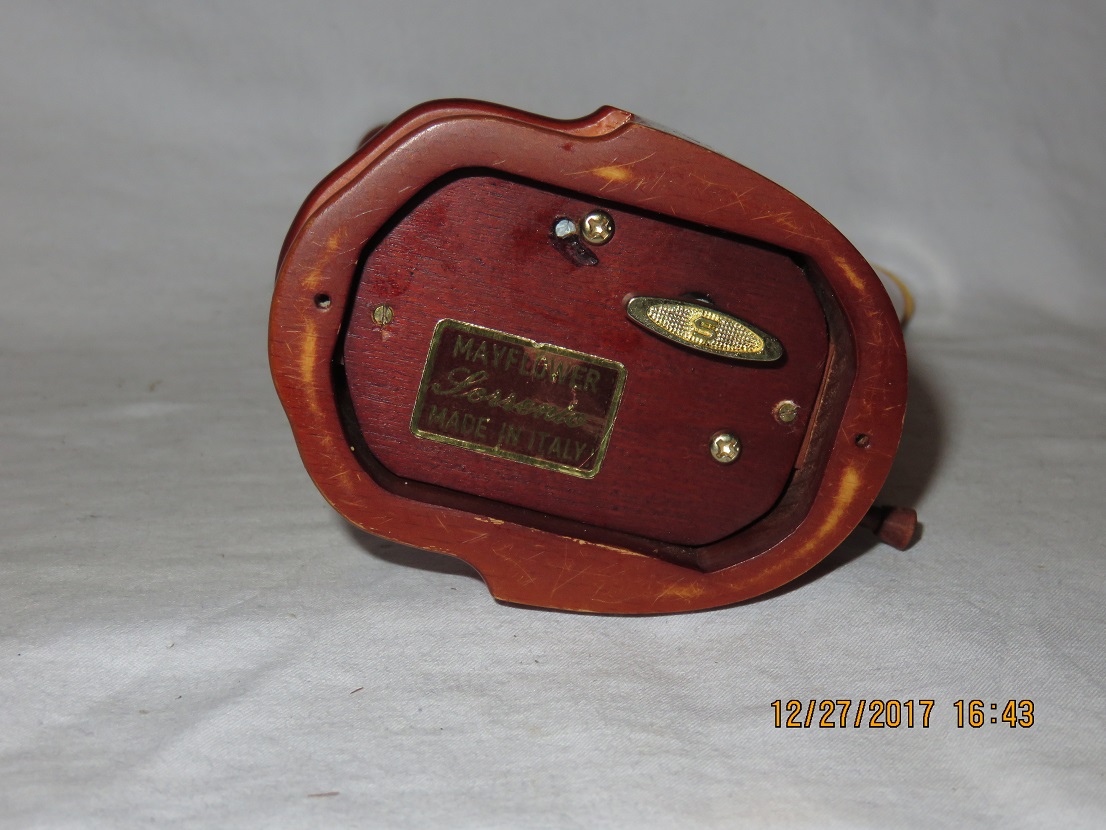 Mayflower: could refer to either the Thanksgiving song (not tune given) or, more likely here, the name of a well-known restaurant at the time in Sorrento, that may have beren selling these music boxes.. One wonders about the music mechanism, it looks like it has been replaced, extra hole in bottom not matching music mechanism and seems earlier than the piece itself that looks like seventies. |