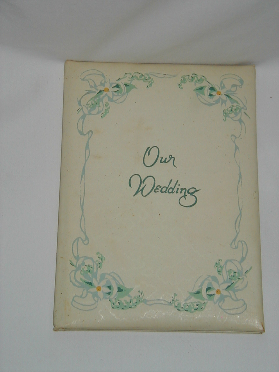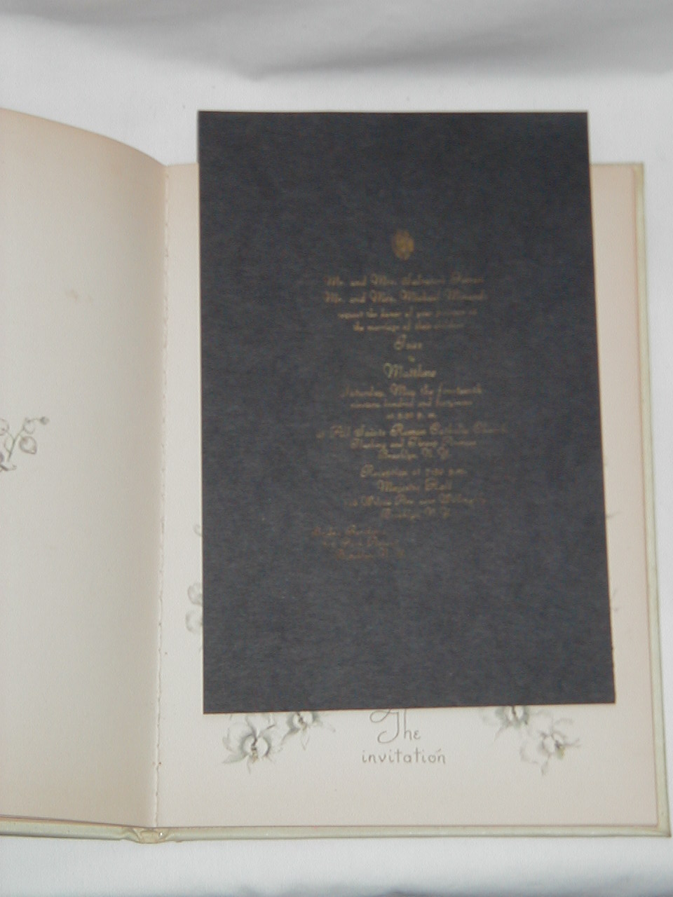 Music mechanism is inside compartment in the briefcase (NOT in any of the wedding books). The wedding card mentions the wedding between Ines Ferrari and Matthew Minando on May 14, 1949 in the All Saints Roman Catholic Church in Brooklyn, N.Y. All other information relates to same. Should any of the marriried couple or any (proven) family be interested in the 3 documents (see hereafter), i will make them available. Please take up contact via my email. The briefcase contains a large wedding book' Our Wedding" in plastic or cellophane cover which can only contain photographs, that is completely empty. Then there is a smaller book, also entitled 'our Wedding", copyright 1942 by C.R.Gibson and Comp, Norwalk, Conn with information about the marriage, gifts,etc., including a written report on the honeymoon The second booklet is titled 'autographs', with lock, no key but opens, apparently started June 1944 by Ines Ferrari, for friends and family to leave a message on a page The third book is an 'Autograph Album Mark Hopkins JHS', with zipper, also from Ines ferrari and gives all kind of school information. But her name is given here as 'Enes', not Ines. Mark Hopkins JHS is name of school. Enes was president of Class Officers and graduated on 6/27/47. Also some corsages (school/marriage) and even marriage candy.
