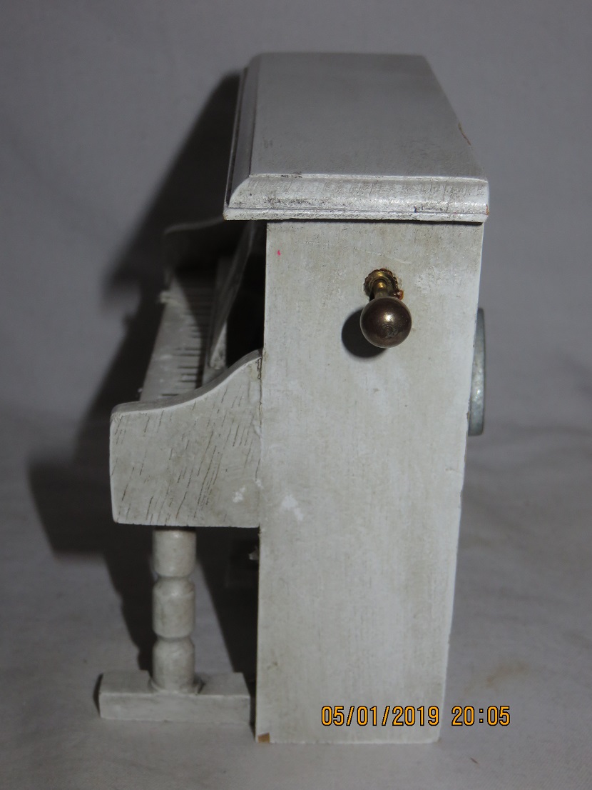 Fair, ingrained dirt in white paint defying cleaning. Paper notes partly gone, paper music on music stand wholly gone. |