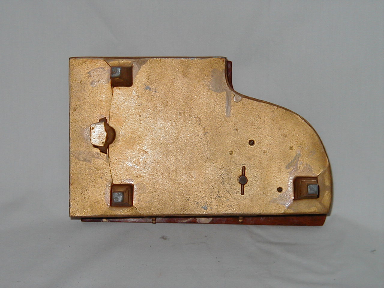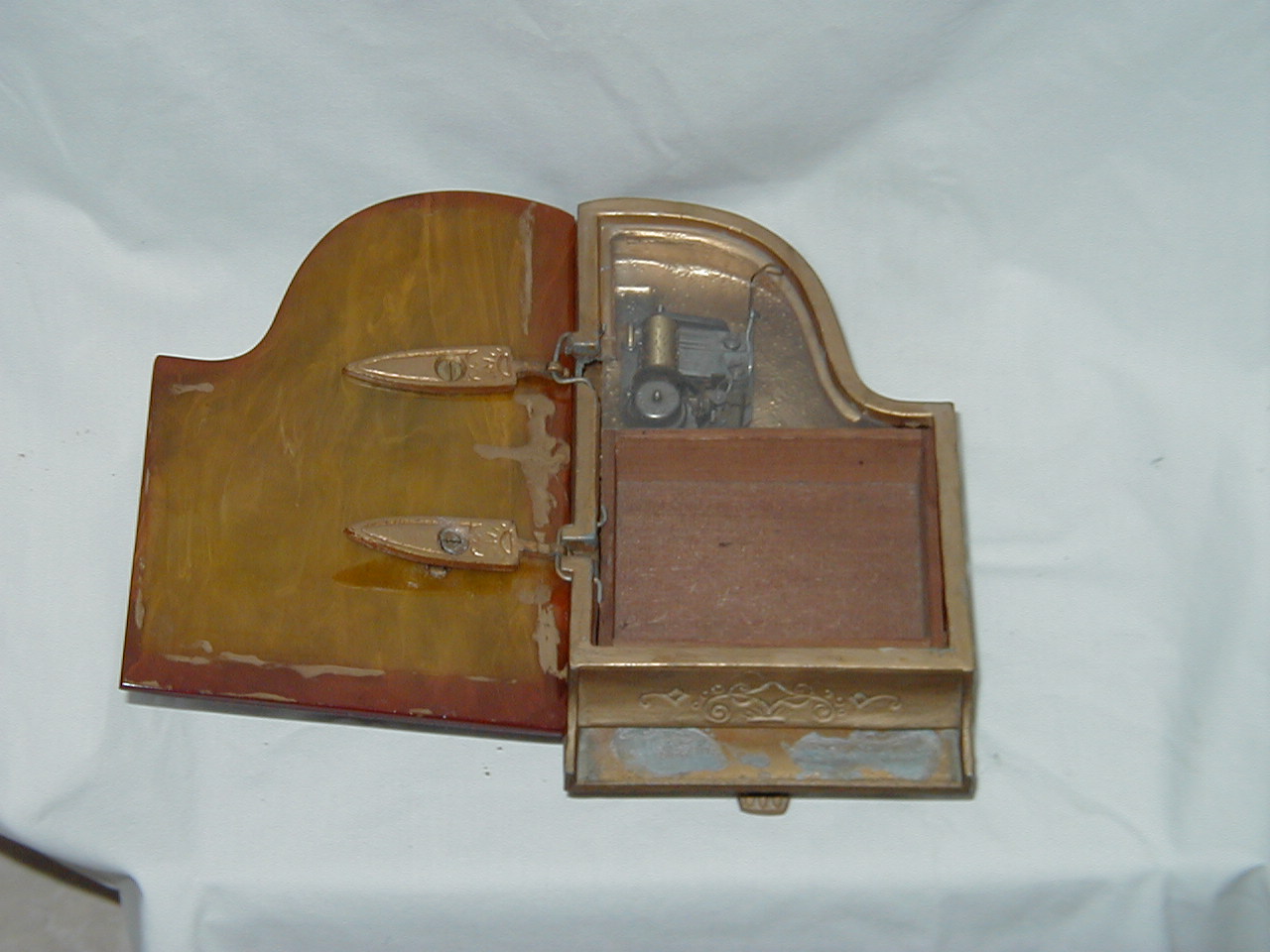 Minimum. One hinge of piano lid is loose; book on top lid broken (and reglued); keys piano gone; chips etc. |