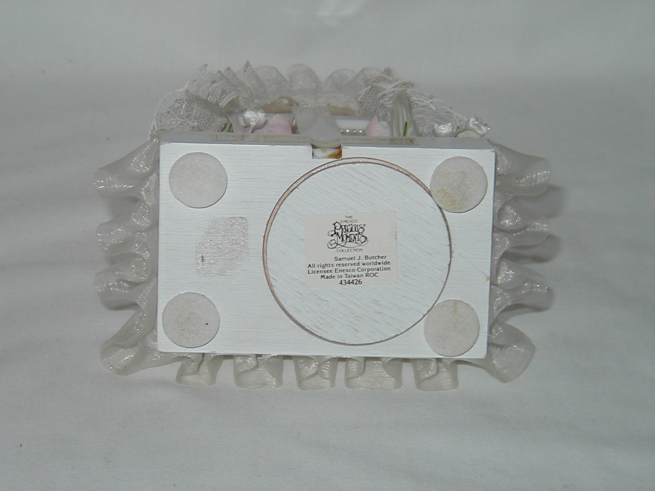 Thre are also 2 Precious Moments labelled items in Musical Toys, that is in Dolls, B 016 035 and Hang Pull Dolls, B 012 004. Because they are toys, not brought into this sub-collection. There are possibly more Precious Moments items, likely in Figurines Pastel Unglazed, but because they are NOT labelled as such, not here indentified in this sub-collection.