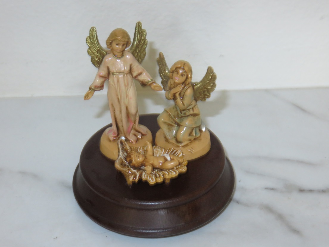 Lefton Baby Jezus in Crib with Animals (Baptism) On inner edge bottom Signature; ' Geo Z. Lefton. 06880'. Sep. Label: 'Do not overwind.Switch on back.'