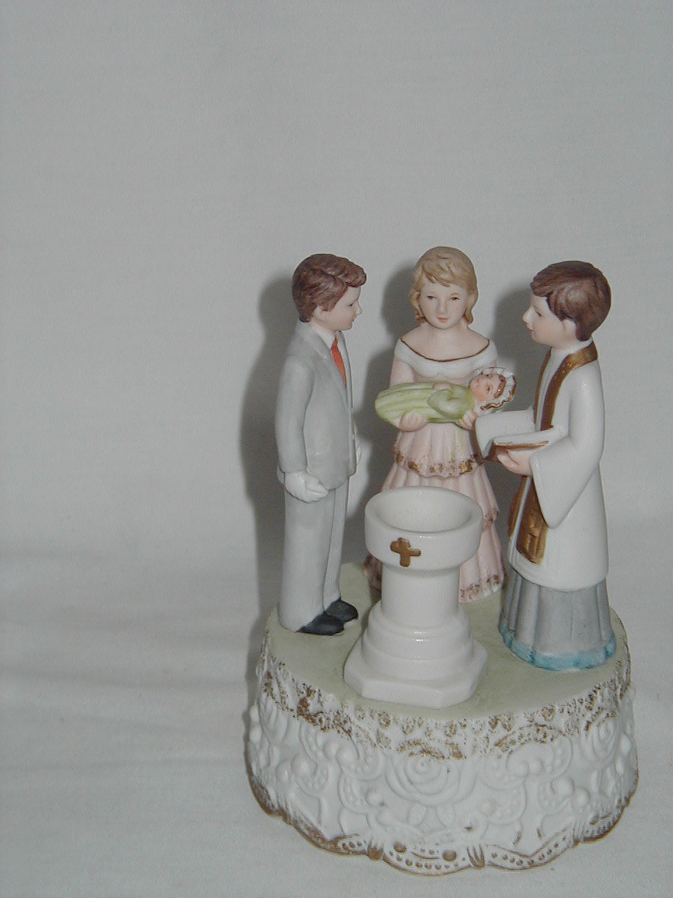 Lefton Baptism of a Baby On inner edge bottom Signature; ' Geo Z. Lefton. 06880'. Sep. Label: 'Do not overwind.Switch on back.'