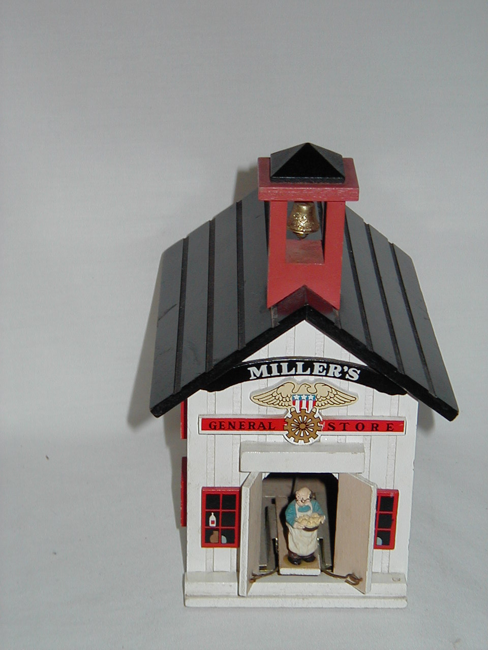 Door opens, grocer appears and retracts, door closes while music plays. |