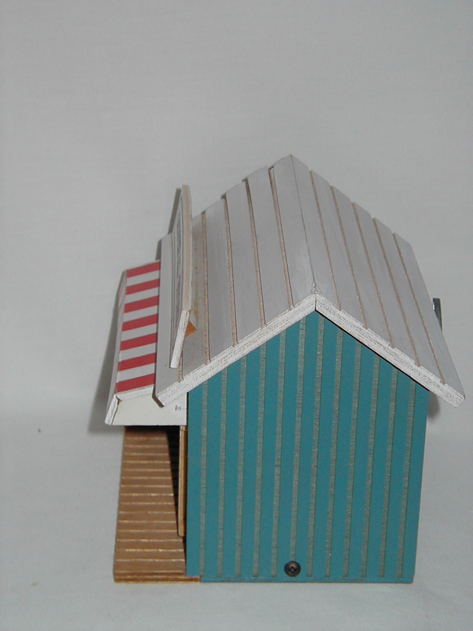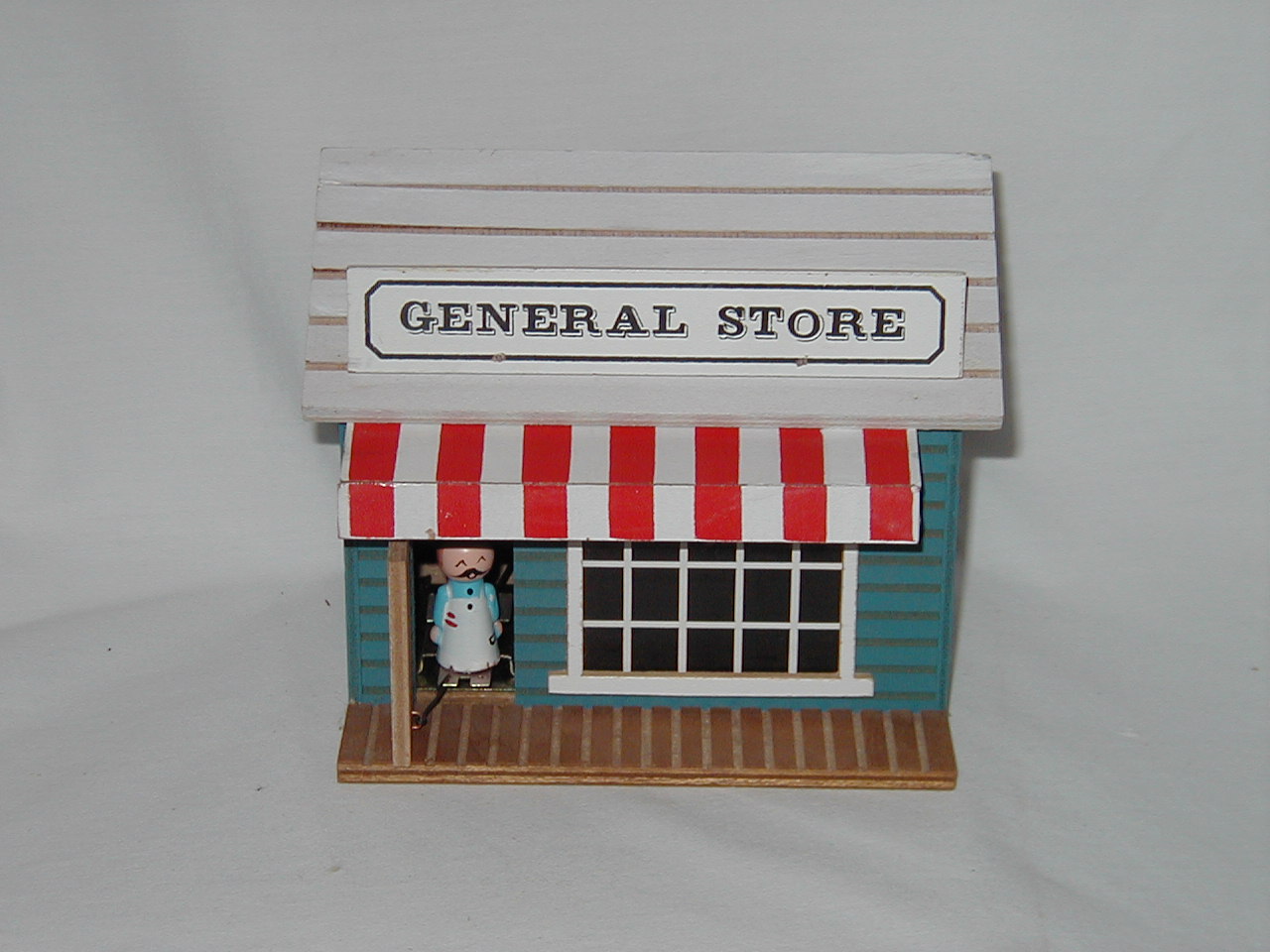 Door opens, grocer appears and retracts, door closes while music plays. |