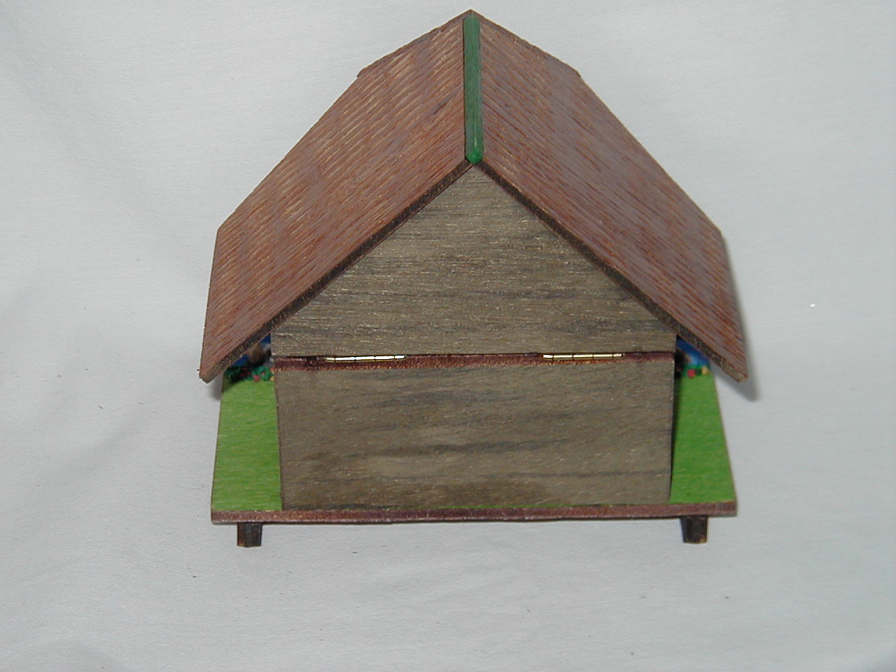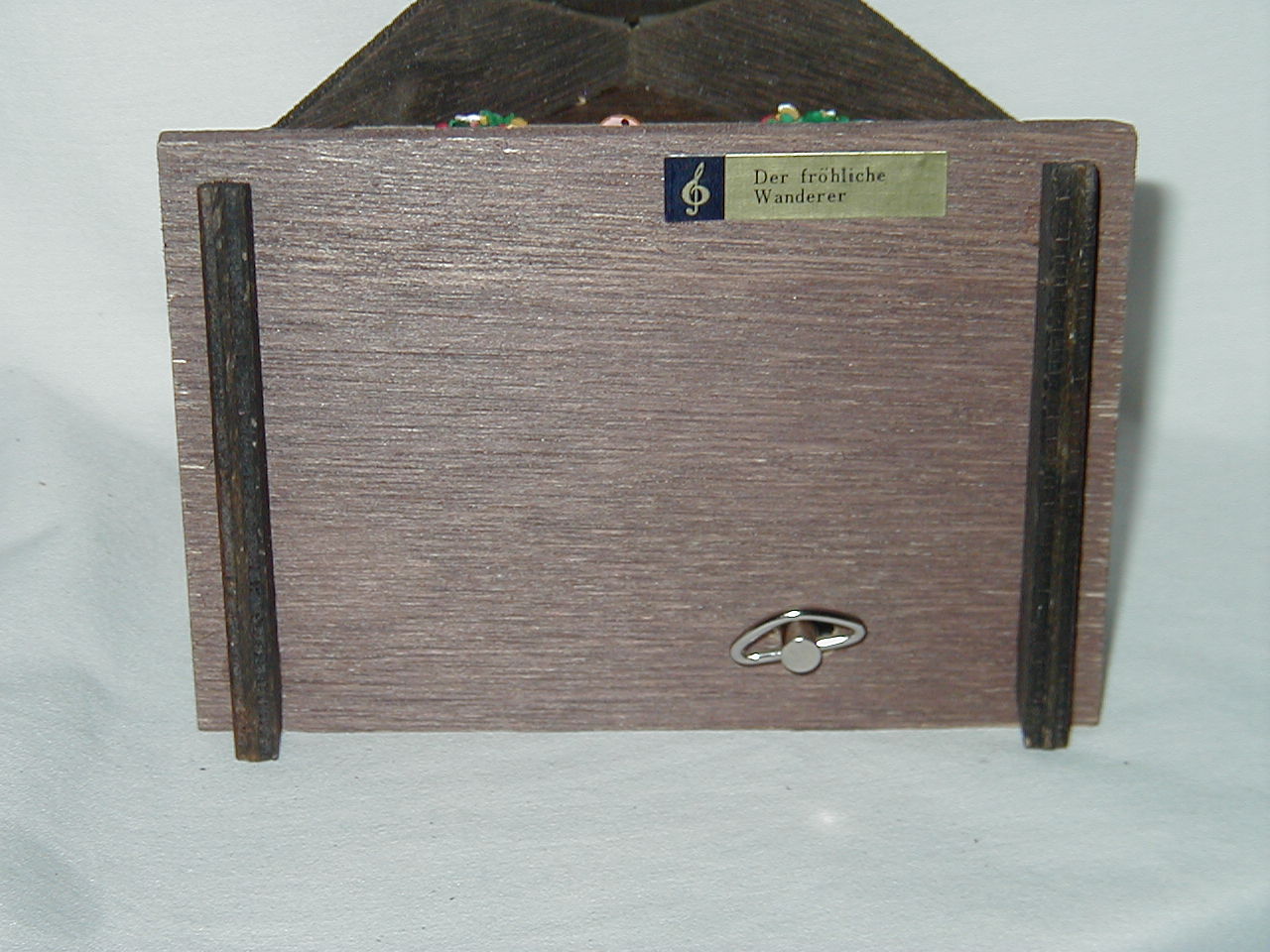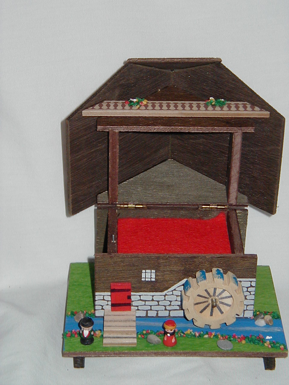 Music starts when roof opens; when roof closes music continues predetermined time by hole in cylinder. |
