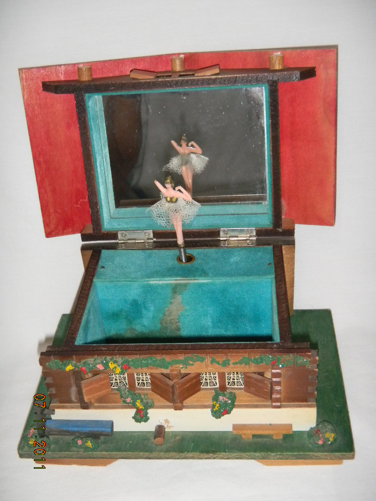 Medium. Ballerina misses right hand. Large spot inside, only partially cleanable. |