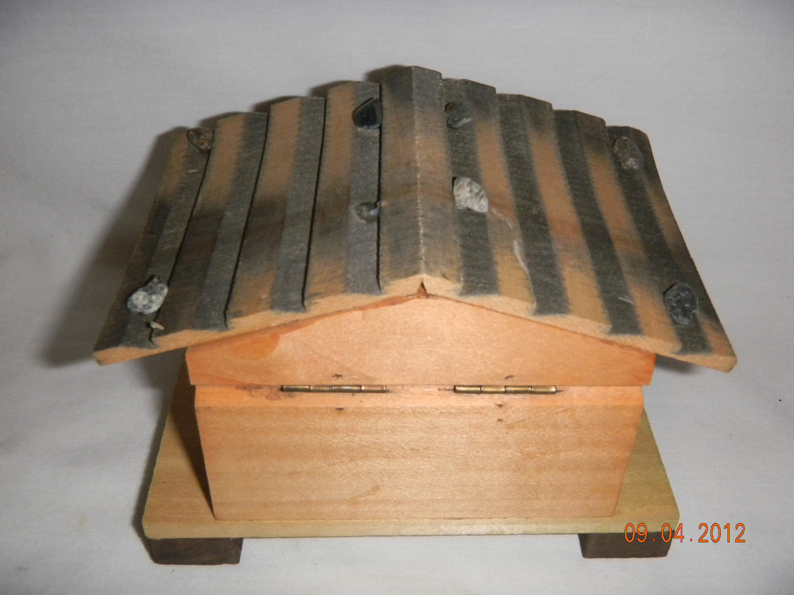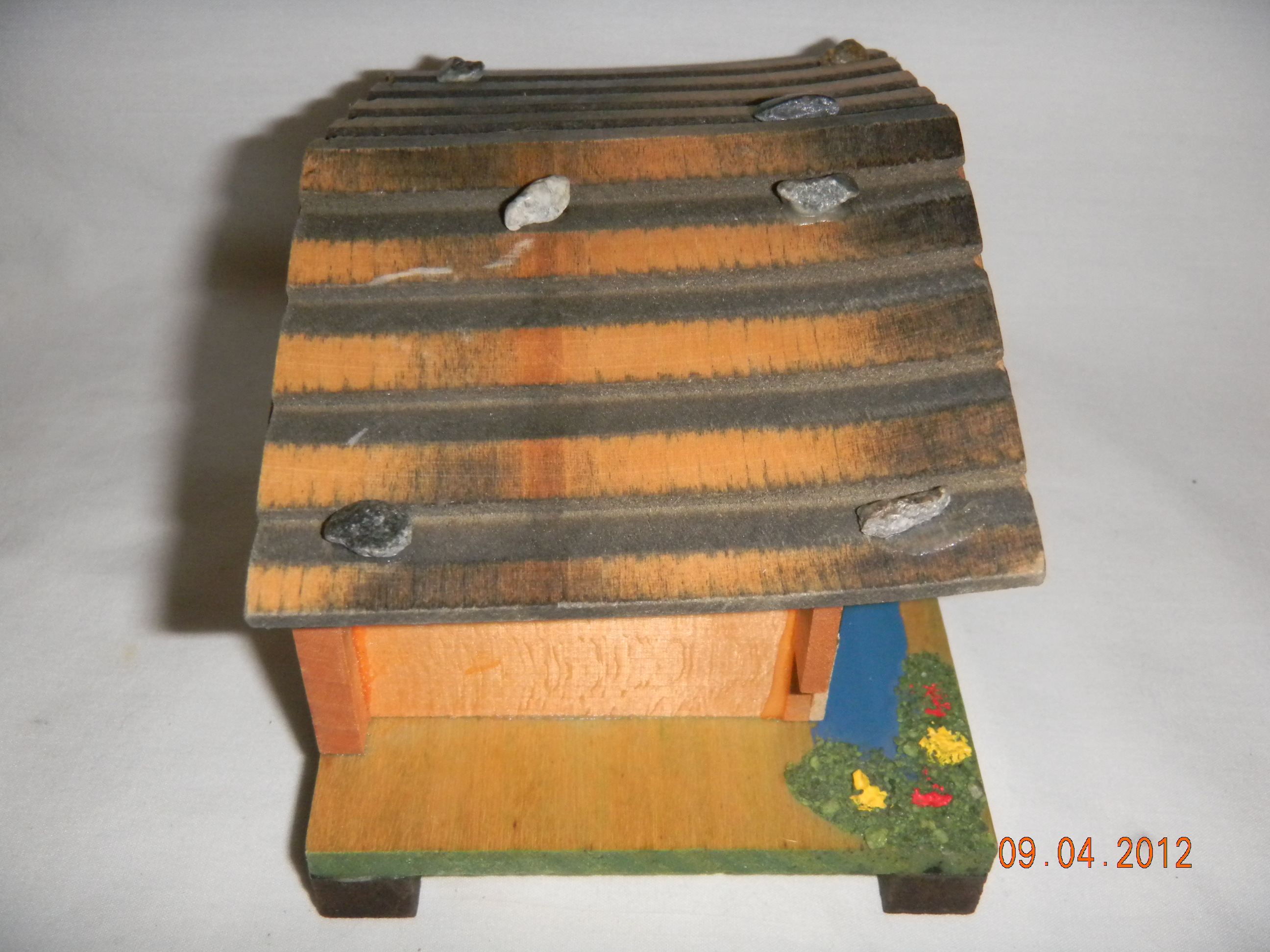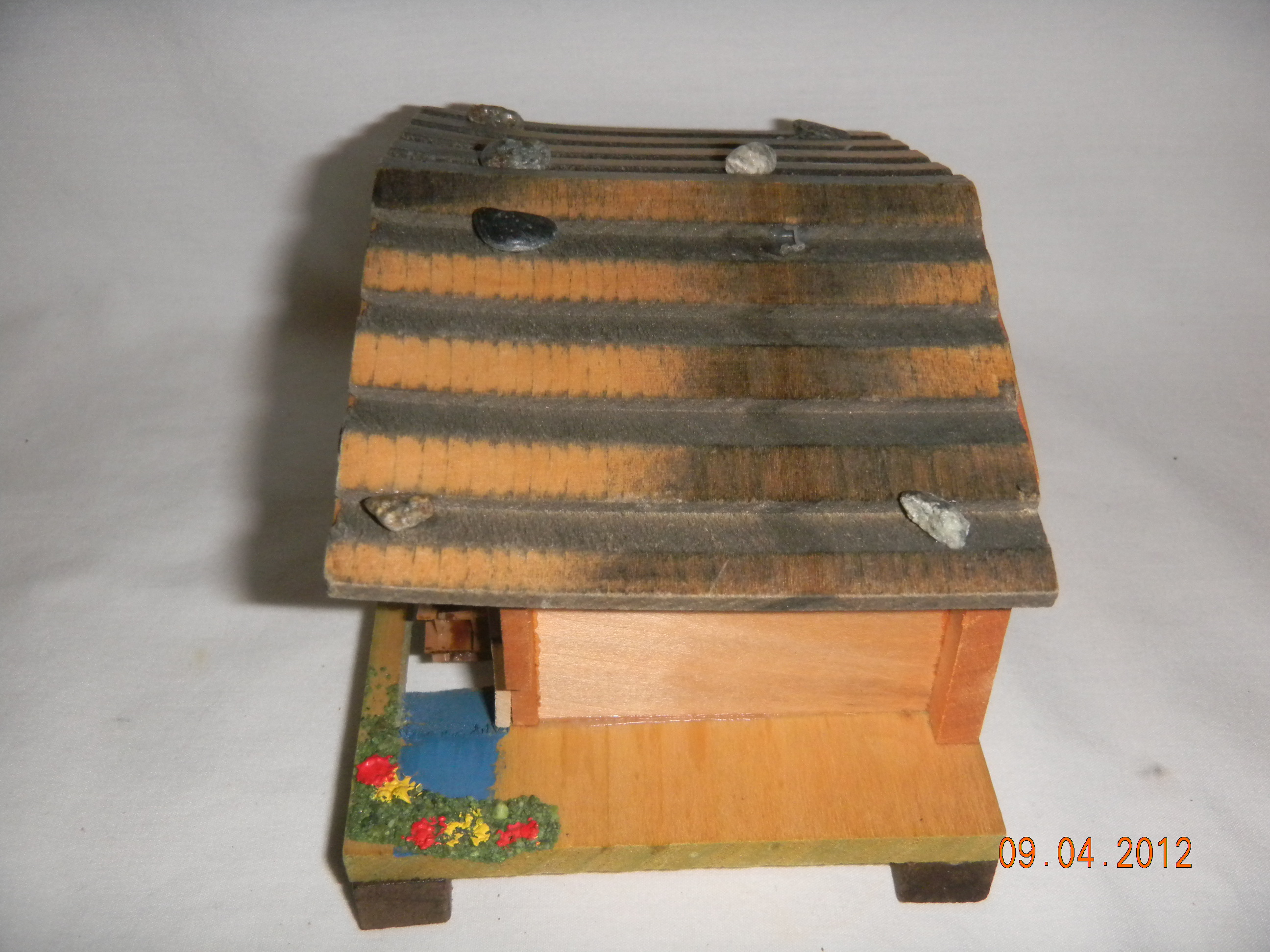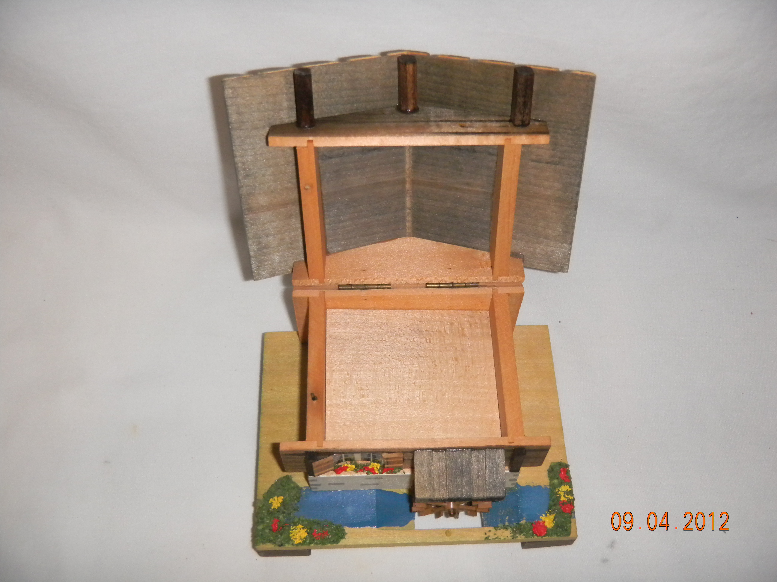 Wood with plastic water wheel. |