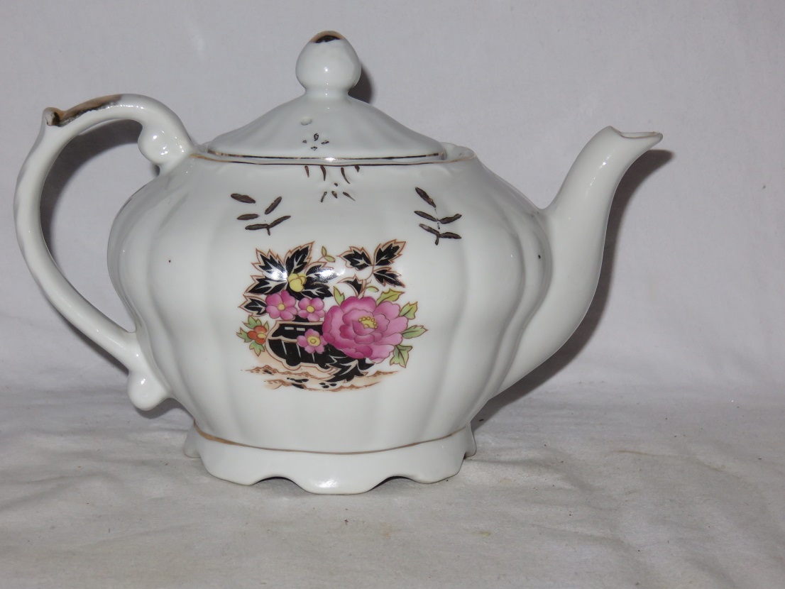 Teapot with Black Leaves and Pink Flowers One Piece Handle