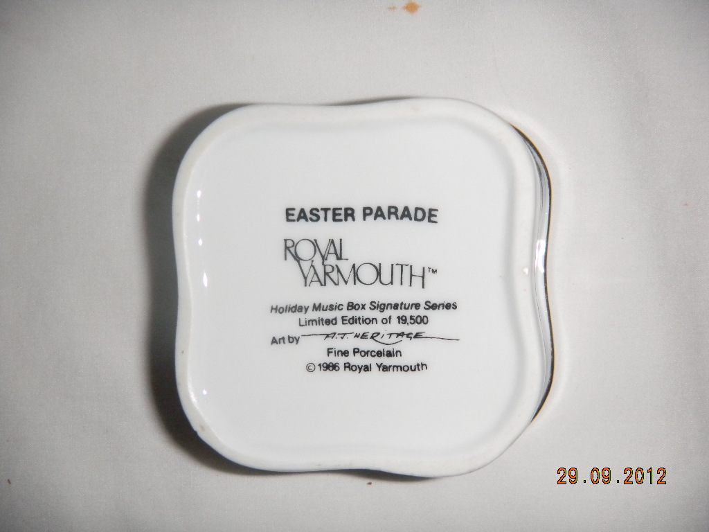 Also mentioned on bottom: ' Limited Edition of 19,500. Art by A.T.Heritage. Fine Porcelain c Royal Yarmouth '. |