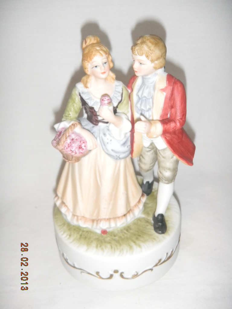 Gentleman Brown Jacket Walking/Talking to Lady, Flower Basket on Arm