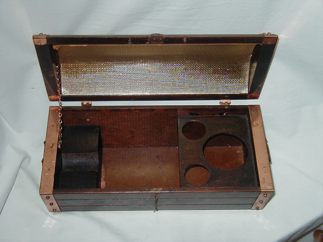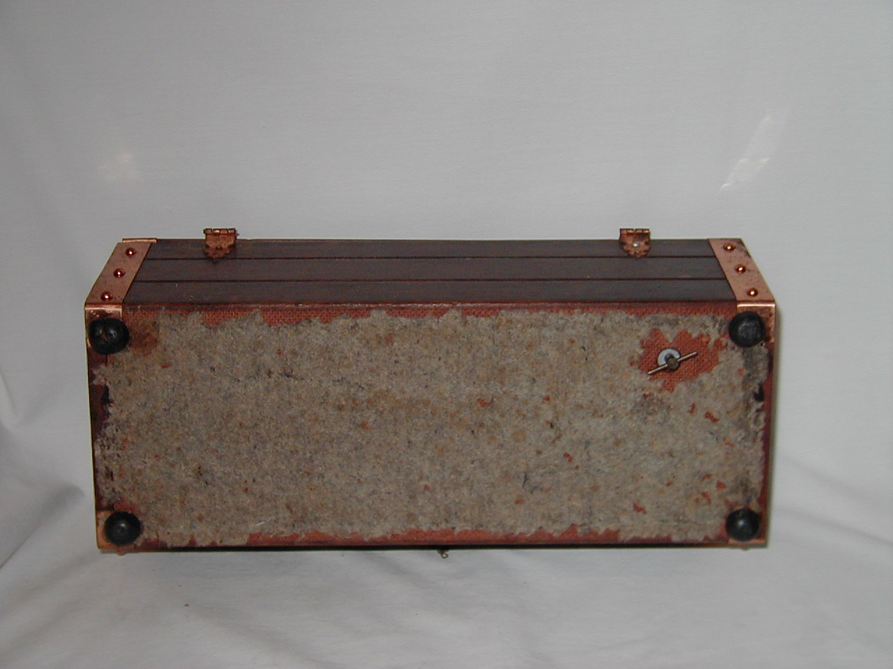 Medium, contents missing, fastenings some repaired, on/off pin spring does not work, case and lock good. |