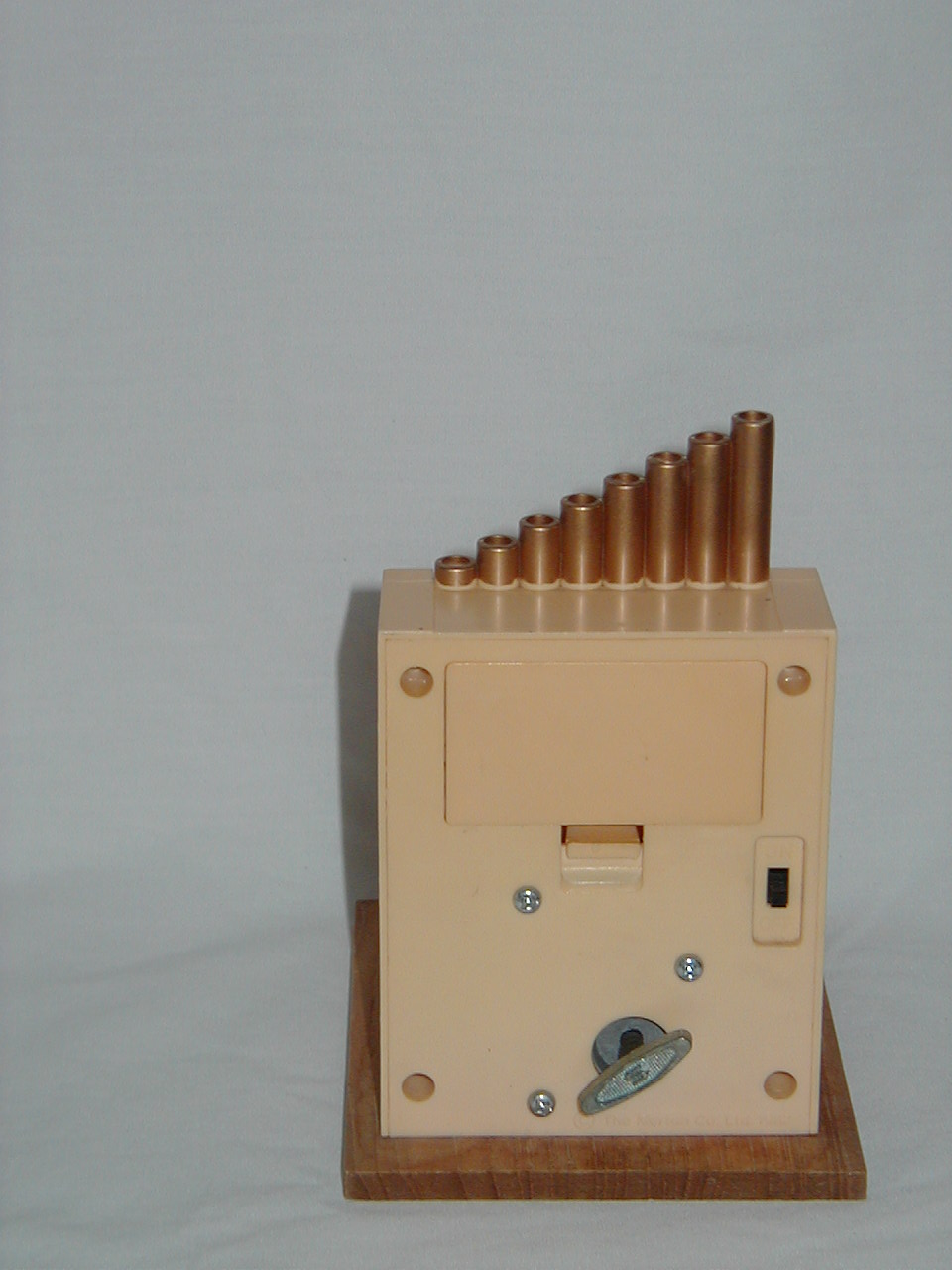 Apart from the wind-on music mechanism, object takes 2 AA batteries that light the 2 candles (working) The Merton Co. Ltd, according to their web site, had all manufacturing in Hong-Kong prior to 1983, when they started moving first some work and later all production to China.