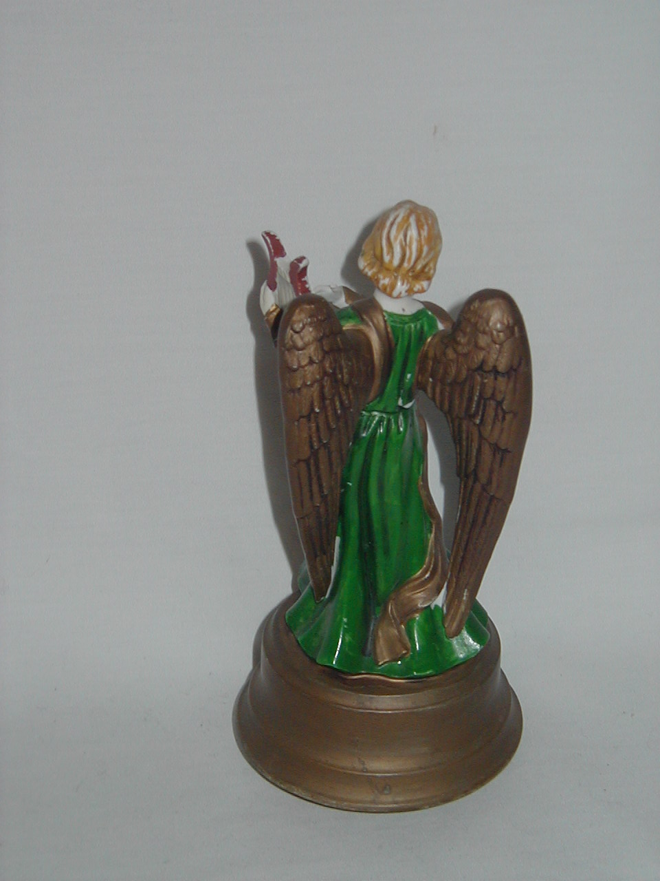 Medium, loss of color on green dress and brown hair and harp; one tooth music mechanism missing. |