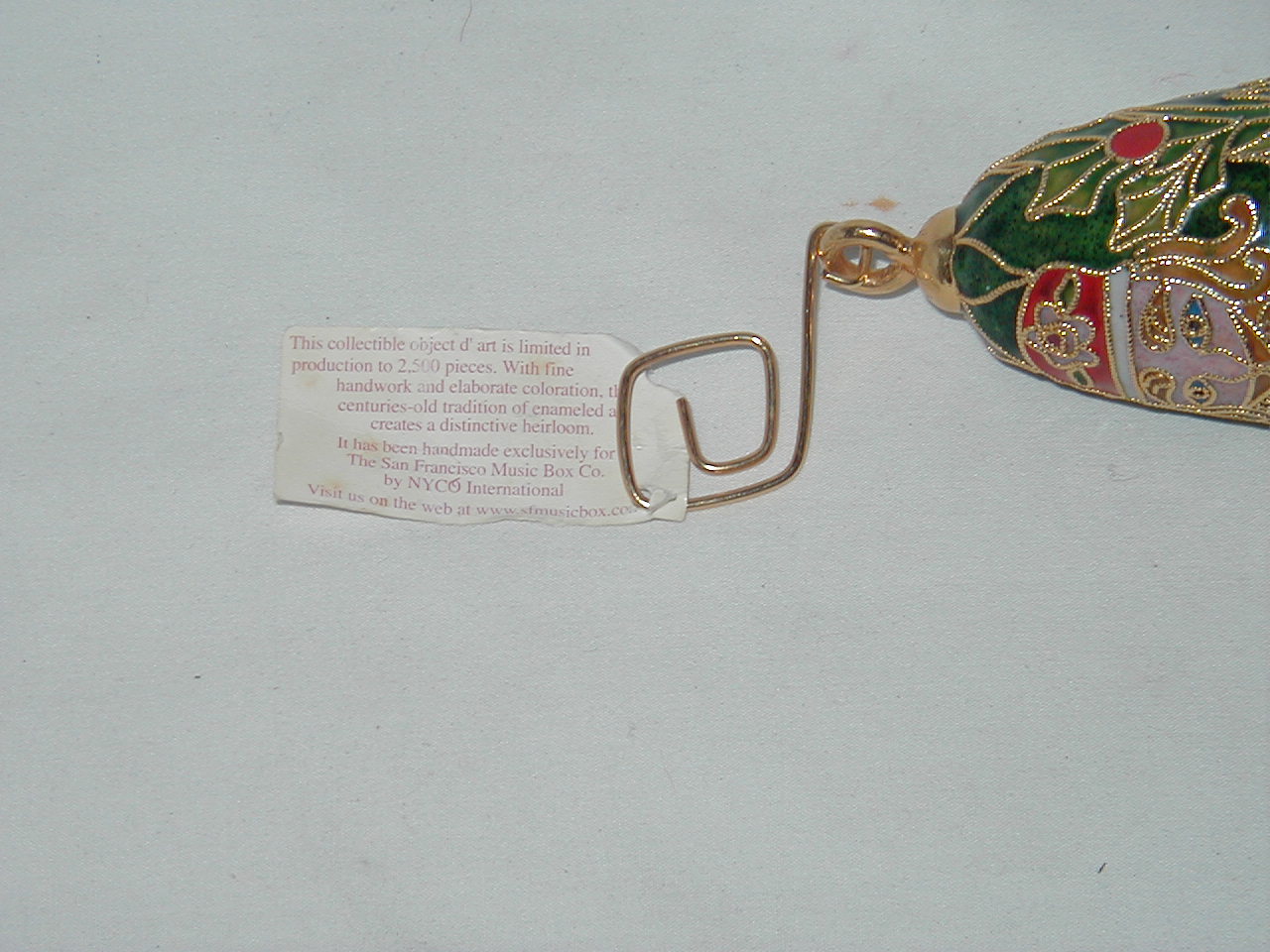 Text on sep. label: ' This collectible object d'art is limited in production to 2,500 pieces. With fine handwork and elaborate coloration, the centuries-old tradition of enameled art creates a distinctive heirloom. It has been hand made exclusively for The San Francisco Music Box Co. by Nyco International. Visit us at the web at www.sfmusicbox.com.'.