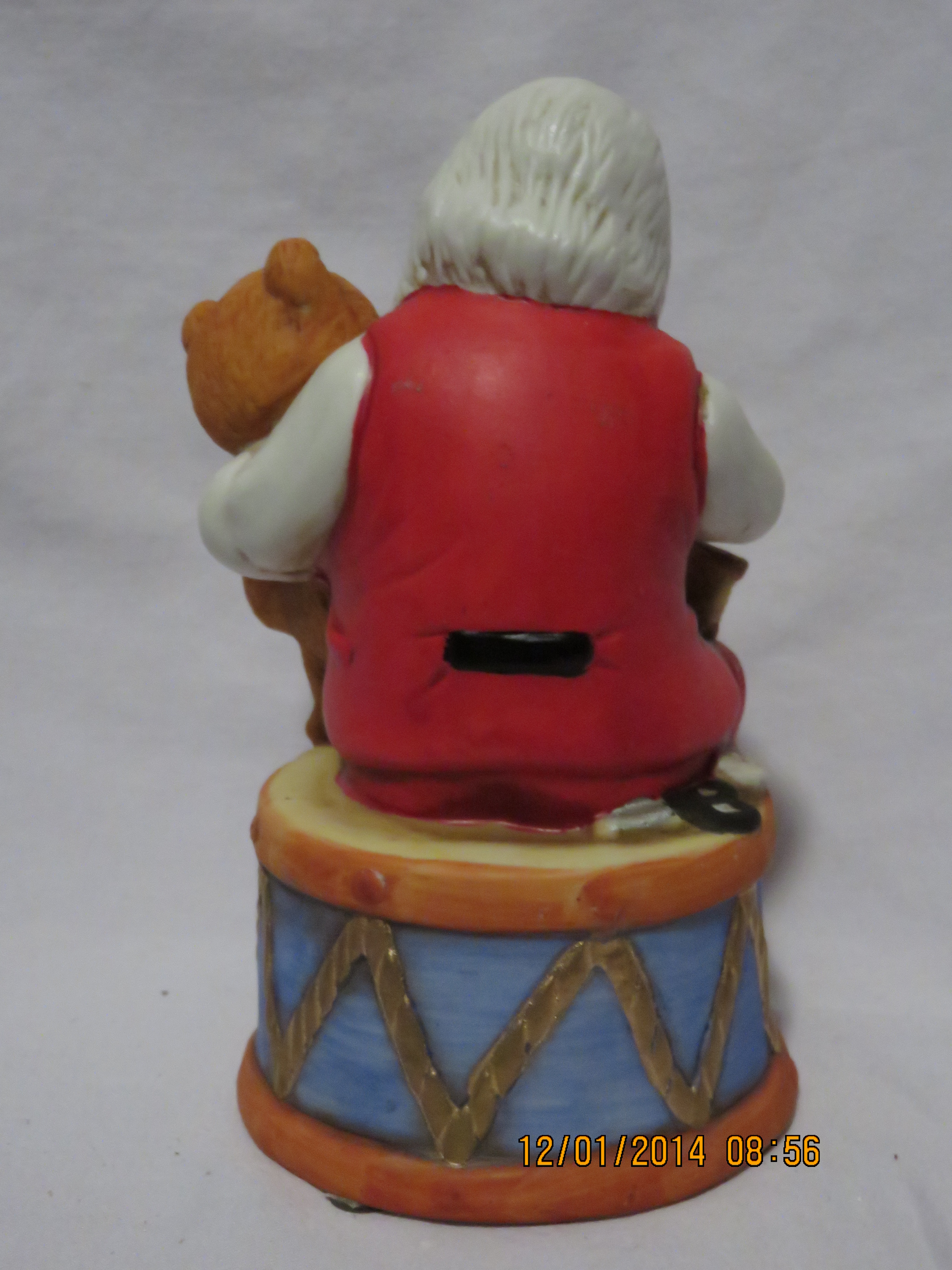 Not clear what object on right knee Santa is, a drink? |