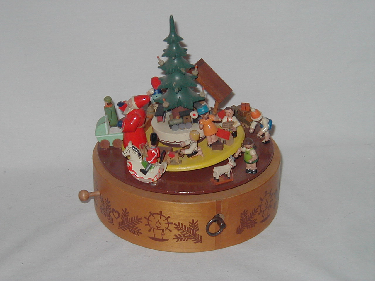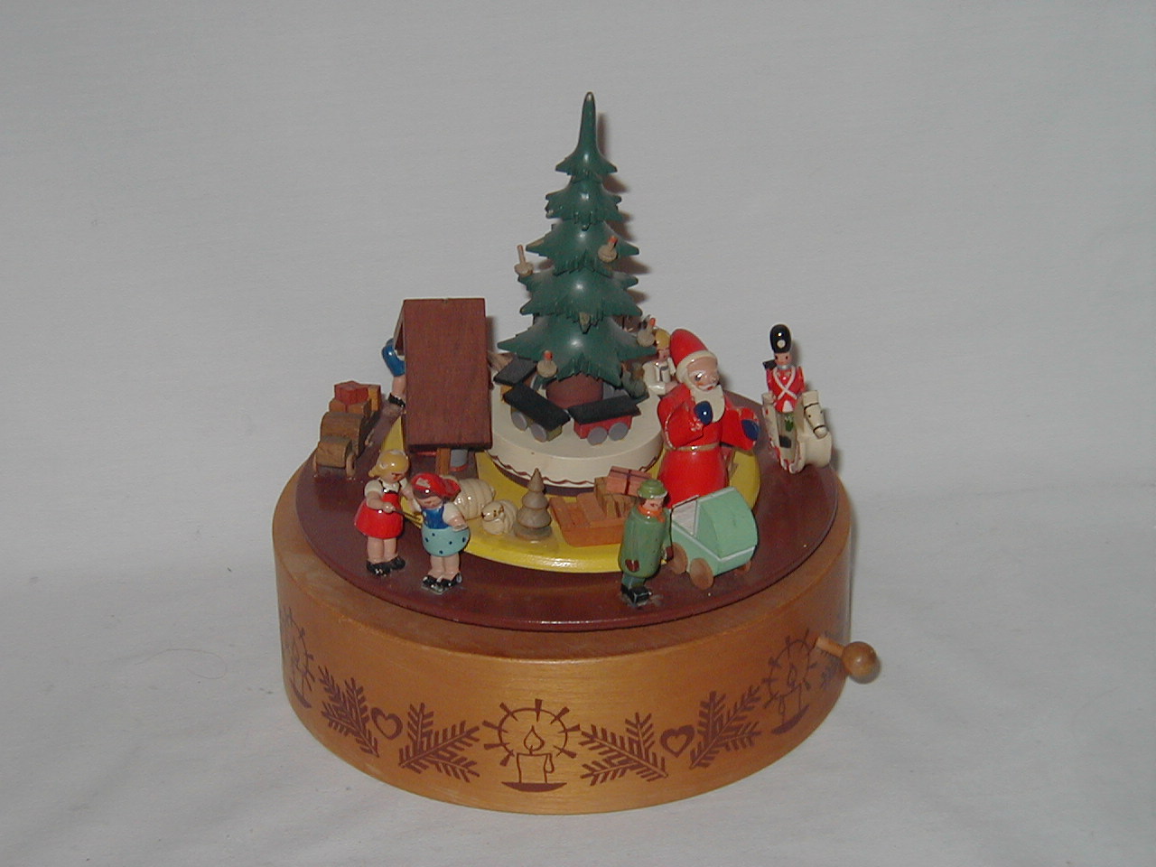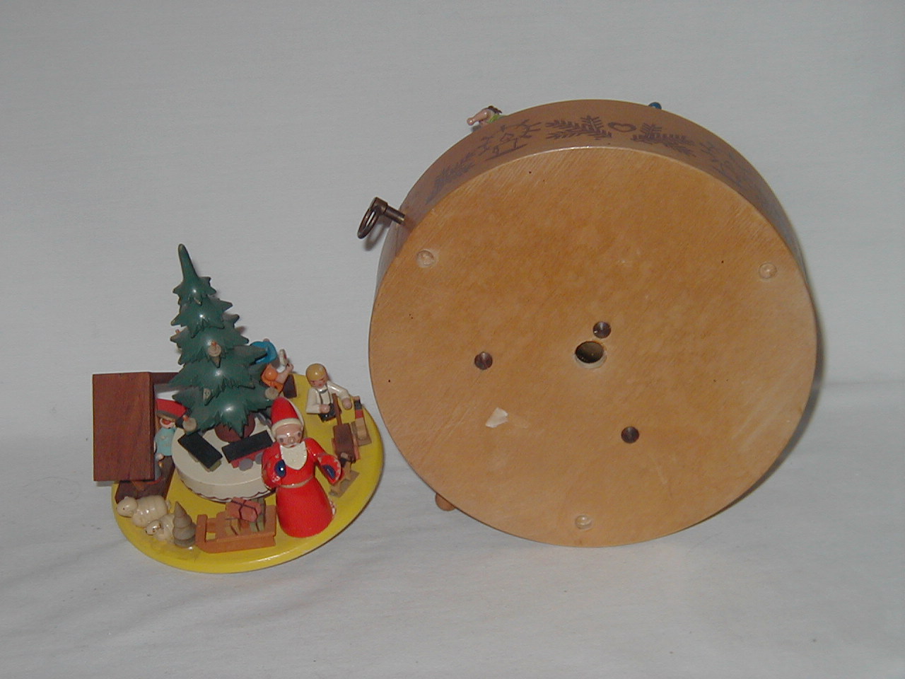 This is a very interesting item as all the figures seem to be present. Origin may be Erzgebirge Germany? The music mechanism has 2 tunes, it stops automatically after one tune and the on/off switch needs to be pulled out and held for a moment to allow second tune to start. This feature was part of older (fifties/early sixties) Reuge or Thorens music mechanisms. Music mechanism is not accessible. Cylinder shows a (production) hole in bottom, but gives no clue. Contrary to most on/off switches, this one needs to be pushed in for music to start, pulled out to stop. In the Christmas tree 4 candles are missing (only missing items as far as can be seen). The inner platform (Tree Santa etc) is now loose. As far as can be seen there was an iron pole connecting it to lower mechanism but it is broken (how do people manage to do that?). As best as can be established that inner platform should remain in place, while the lower platform rotates around it.. Because of fracture, the upper platform rotates with lower platform and is not secured in place.