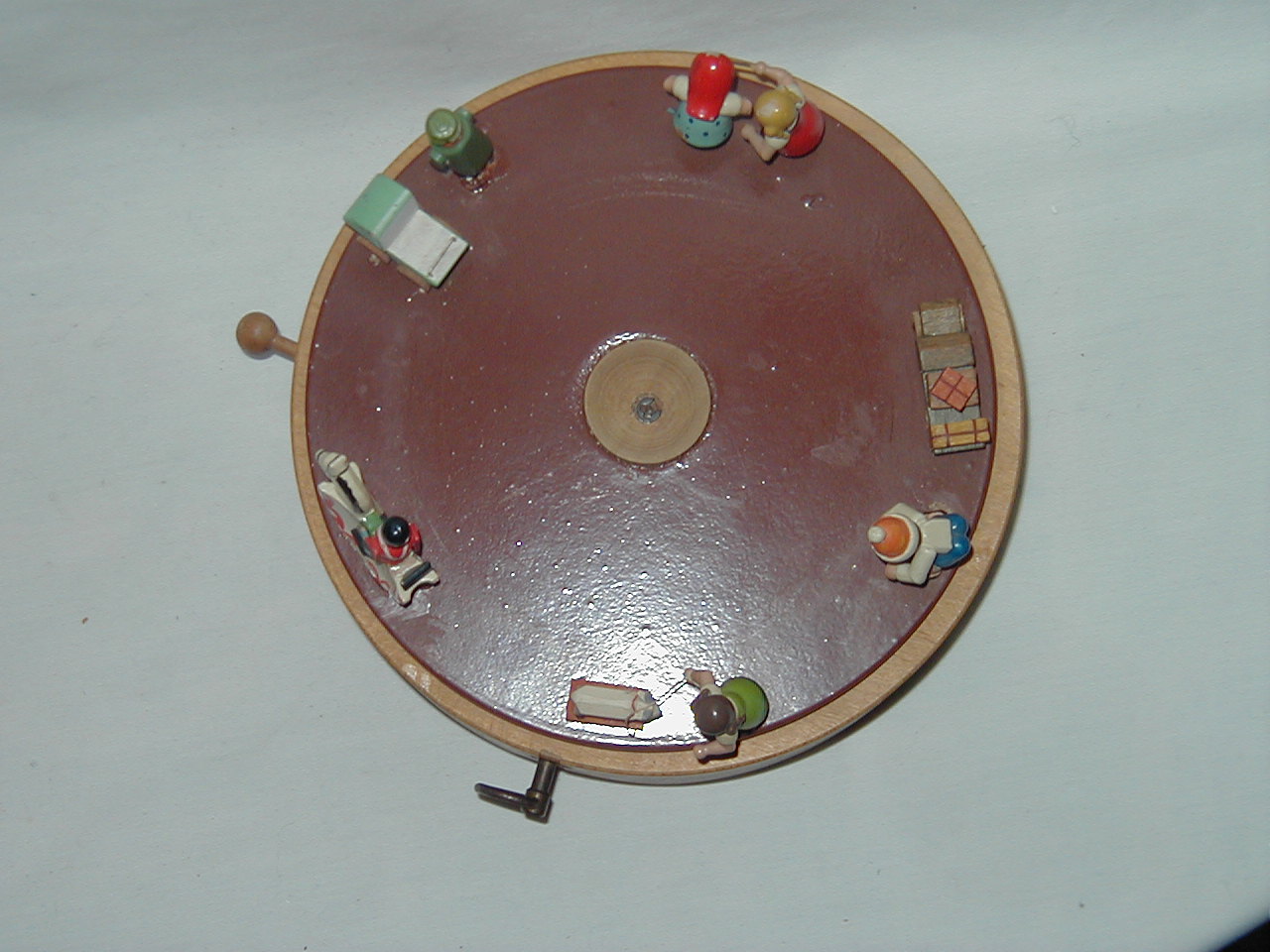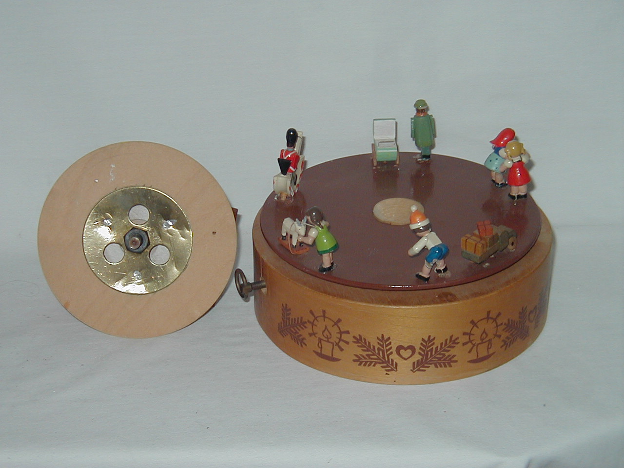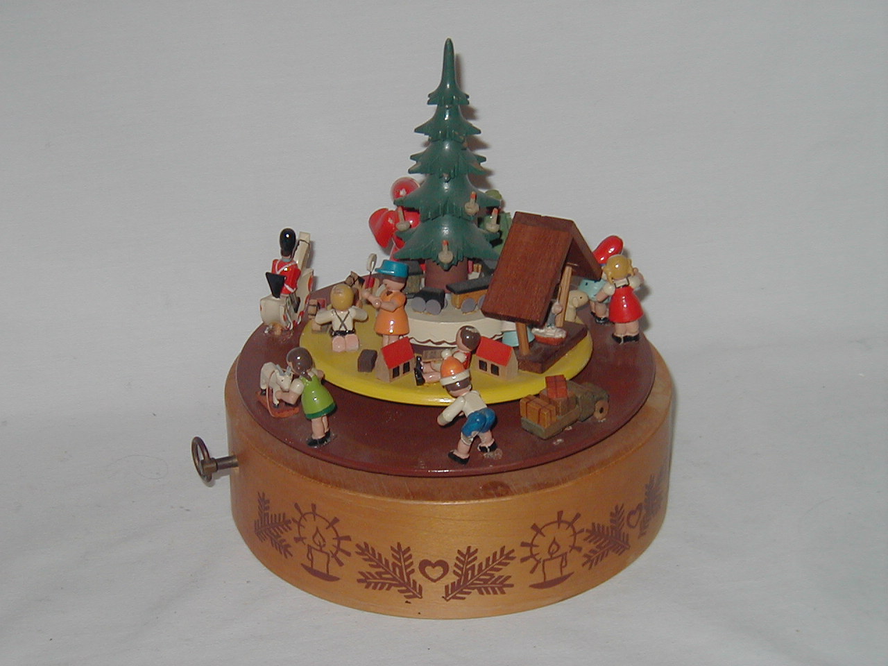 This is a very interesting item as all the figures seem to be present. Origin may be Erzgebirge Germany? The music mechanism has 2 tunes, it stops automatically after one tune and the on/off switch needs to be pulled out and held for a moment to allow second tune to start. This feature was part of older (fifties/early sixties) Reuge or Thorens music mechanisms. Music mechanism is not accessible. Cylinder shows a (production) hole in bottom, but gives no clue. Contrary to most on/off switches, this one needs to be pushed in for music to start, pulled out to stop. In the Christmas tree 4 candles are missing (only missing items as far as can be seen). The inner platform (Tree Santa etc) is now loose. As far as can be seen there was an iron pole connecting it to lower mechanism but it is broken (how do people manage to do that?). As best as can be established that inner platform should remain in place, while the lower platform rotates around it.. Because of fracture, the upper platform rotates with lower platform and is not secured in place.