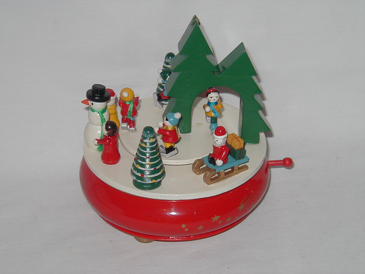 Inner platform on top rotates with music, so that it seems that the 4 figures on platform are passing under stylized trees. |