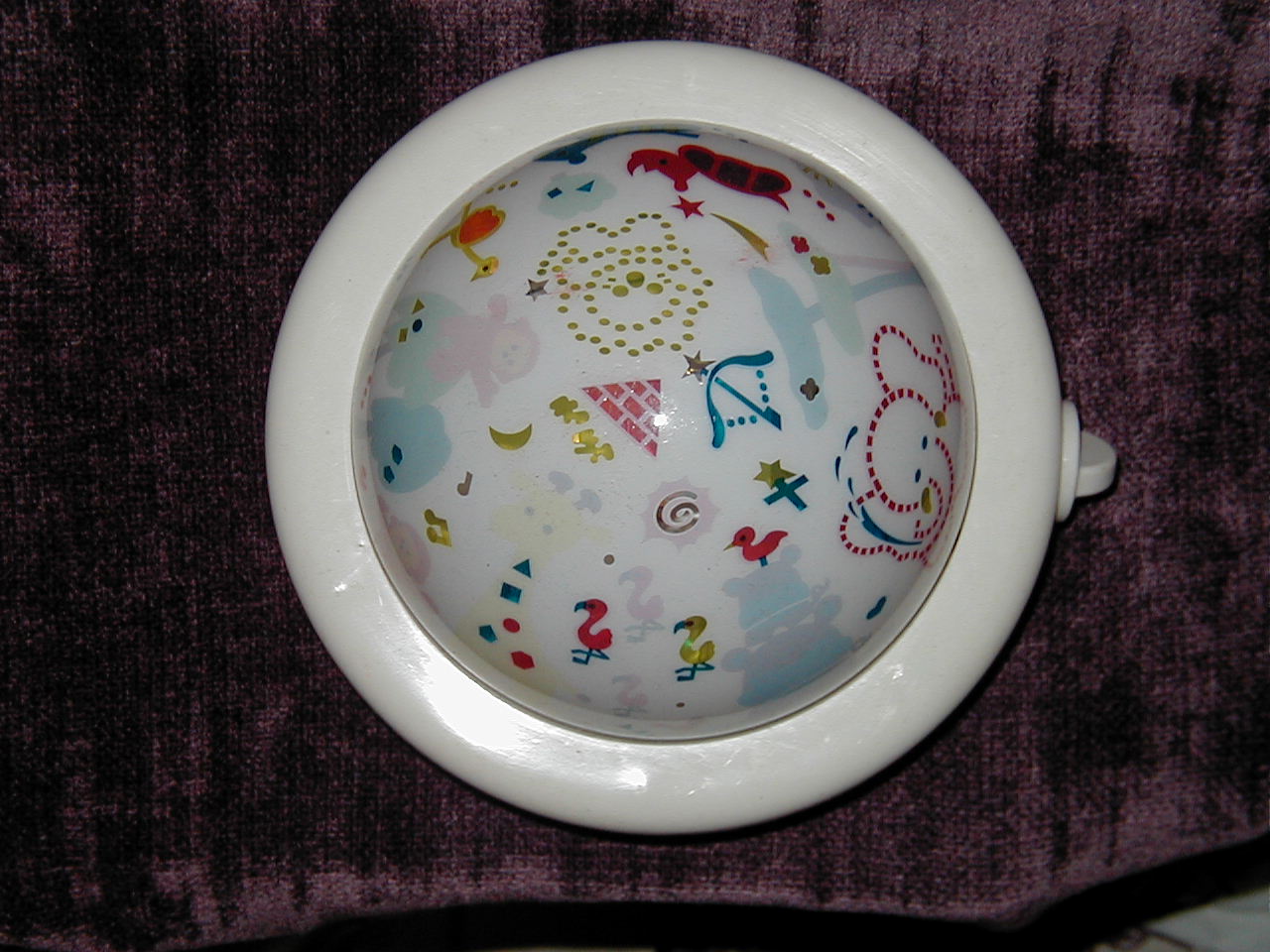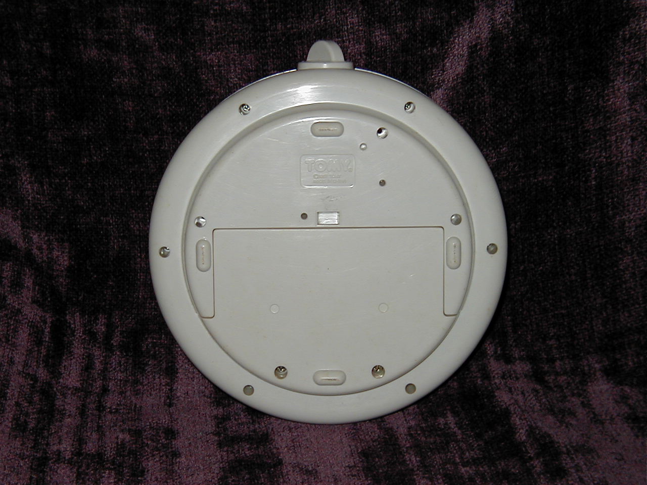 This item takes 3 D batteries, lid in bottom. Once this lid is removed another small lid is visible, which can be moved sideways to get to bulb. Lights not now tested, but worked when bought. Music and rotating cupola work fine.