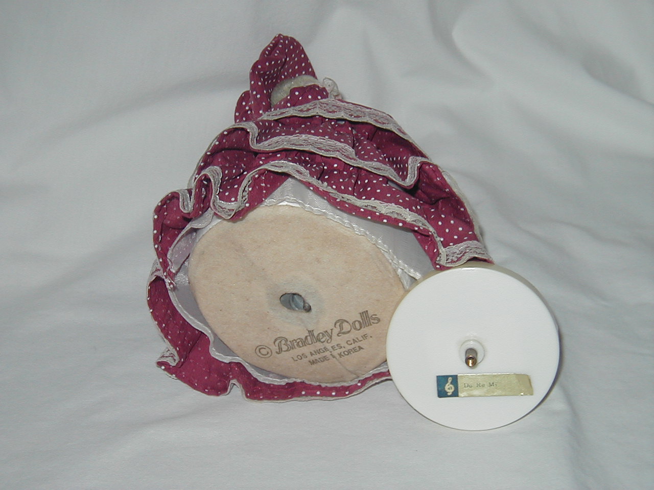 Yes, plastic, label ' Bradley Dolls, Los Angeles, Calif.; Made in Korea '. |