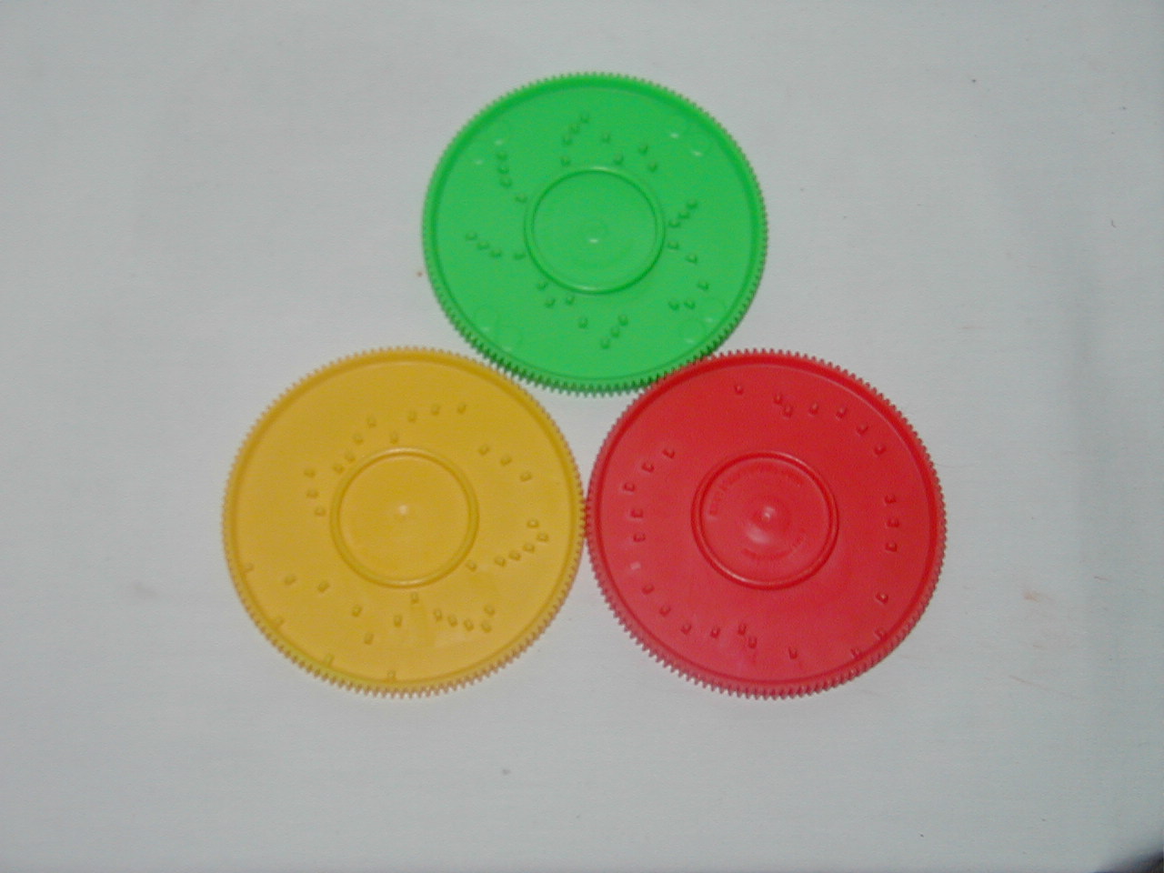There are 3 records each with a song on each side, 6 songs in total as follows: London Bridge and Freres Jacques (numbered 1A), Pop goes the Weasel and Mary had a little Lamb (numbered 2) and When the Saints go Marching in and She'll be coming round the Mountain (numbered 3A).