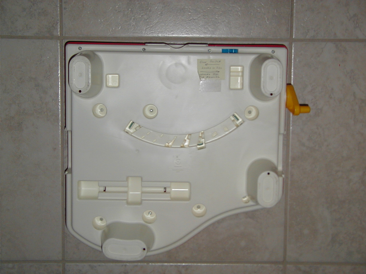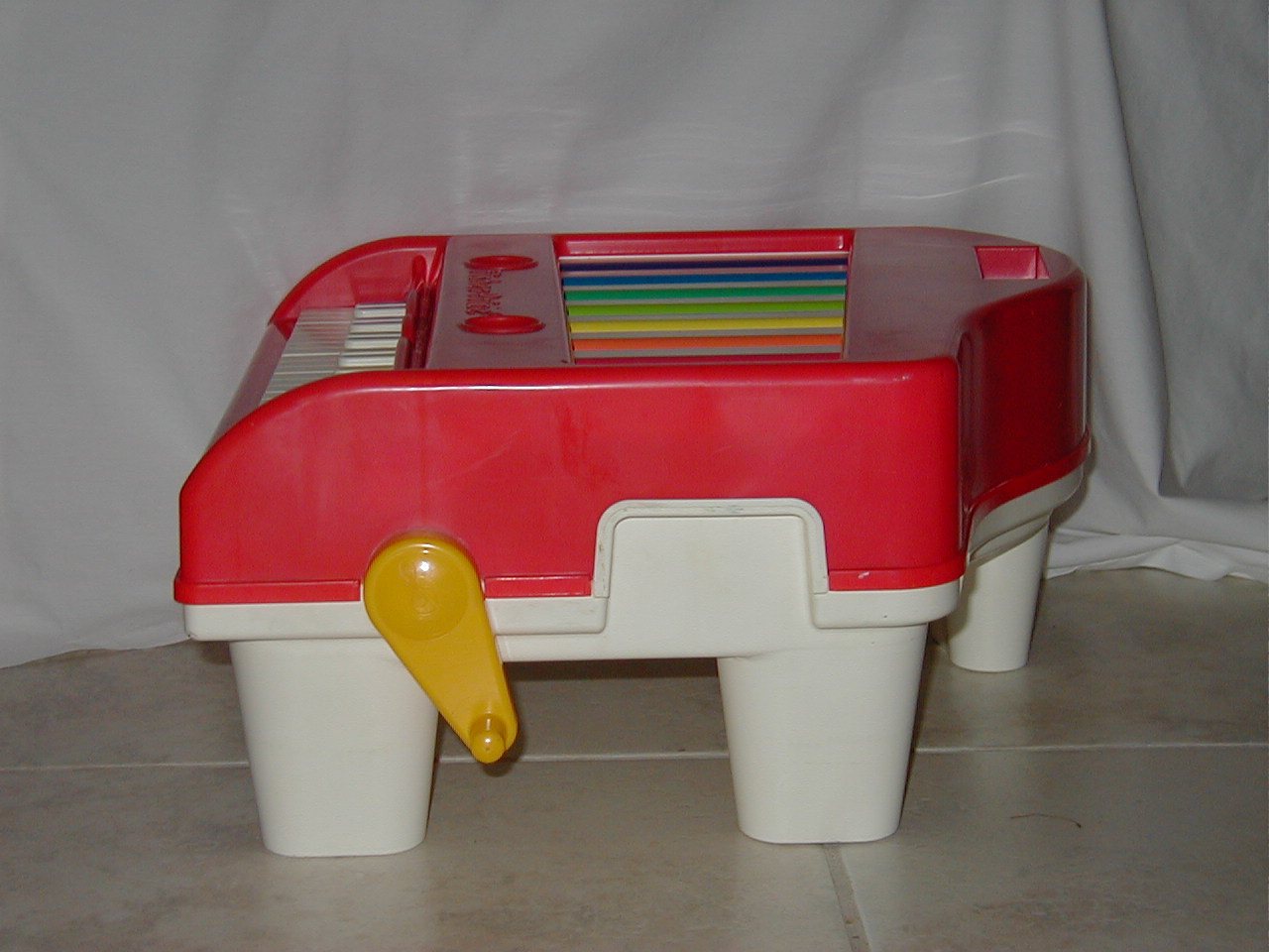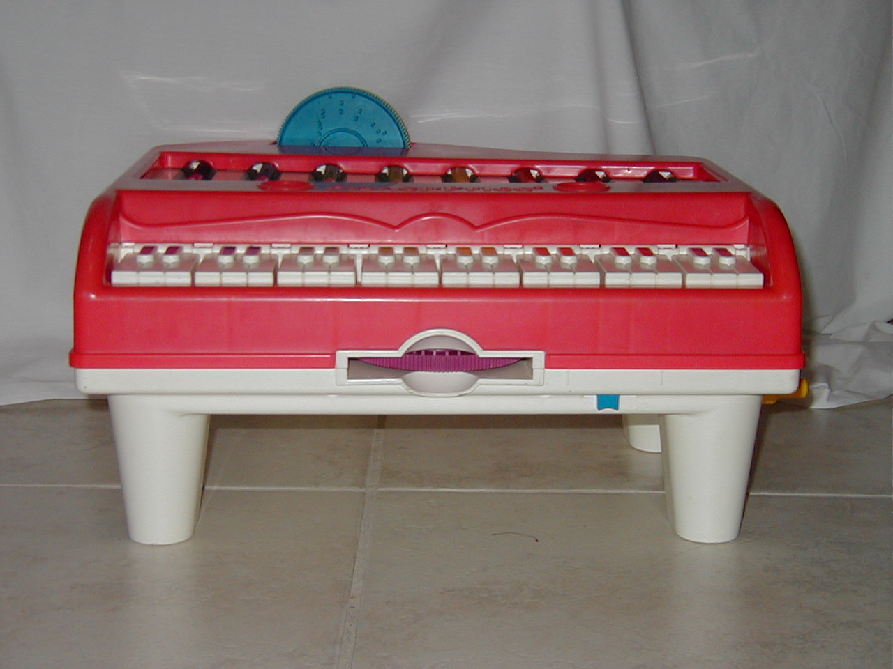 Put one of the disks in the opening in front and lock with the blue knob (front). Turn yellow plastic handle on right side for music. Only the xylophone (the colored tubes) are being played. It is also possible to play the keys of the piano, indepently from the disks. Three disks are provided: Green 4 The Muffin Man and As we go Round the Mulberry Bush Blue 5 Sing a Song of Sixpence and I'am a little Teapot Pink 6 Row, Row, Row your Boat and Baa! Baa! Black Sheep All 3 disks mention: 1989 Fisher-Price. Disk. Holder in back of item holds 3 disks, not more. In the bottom of the item it seems there is a place to hold ' something'.