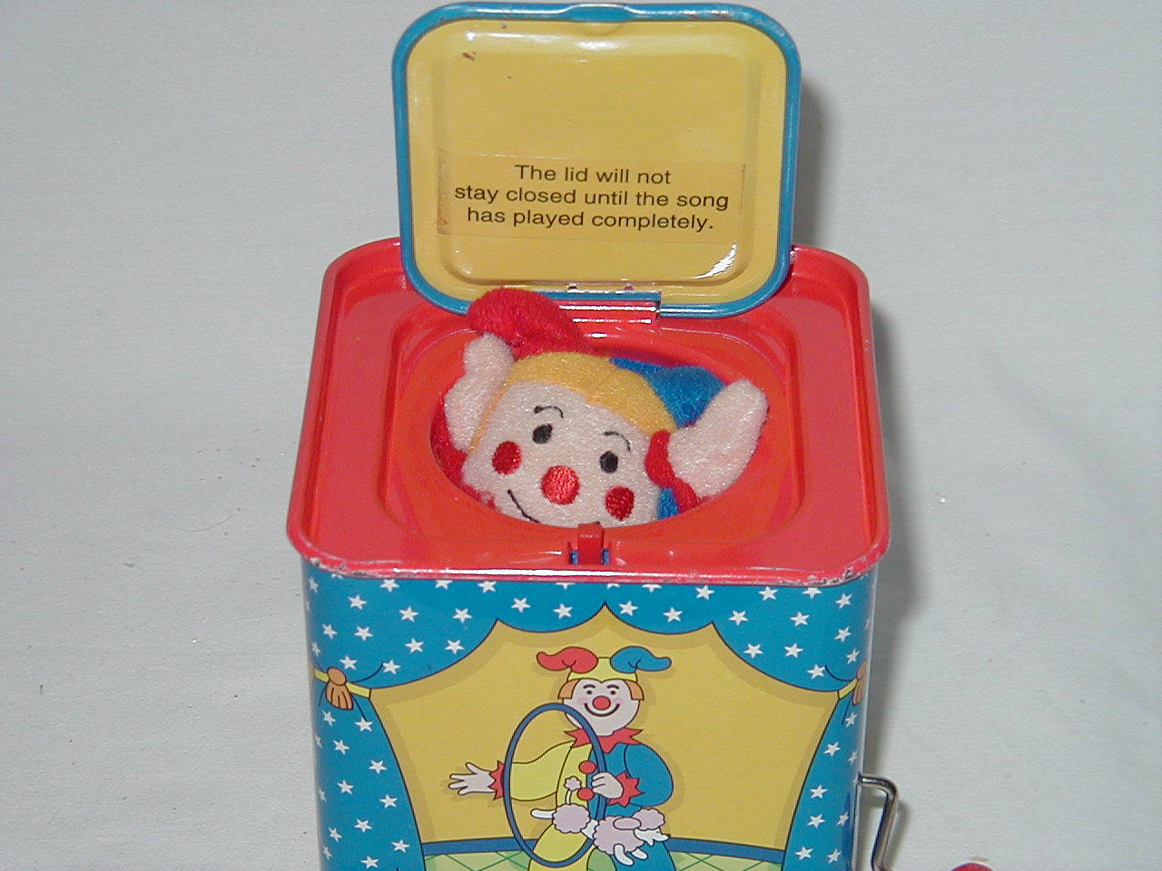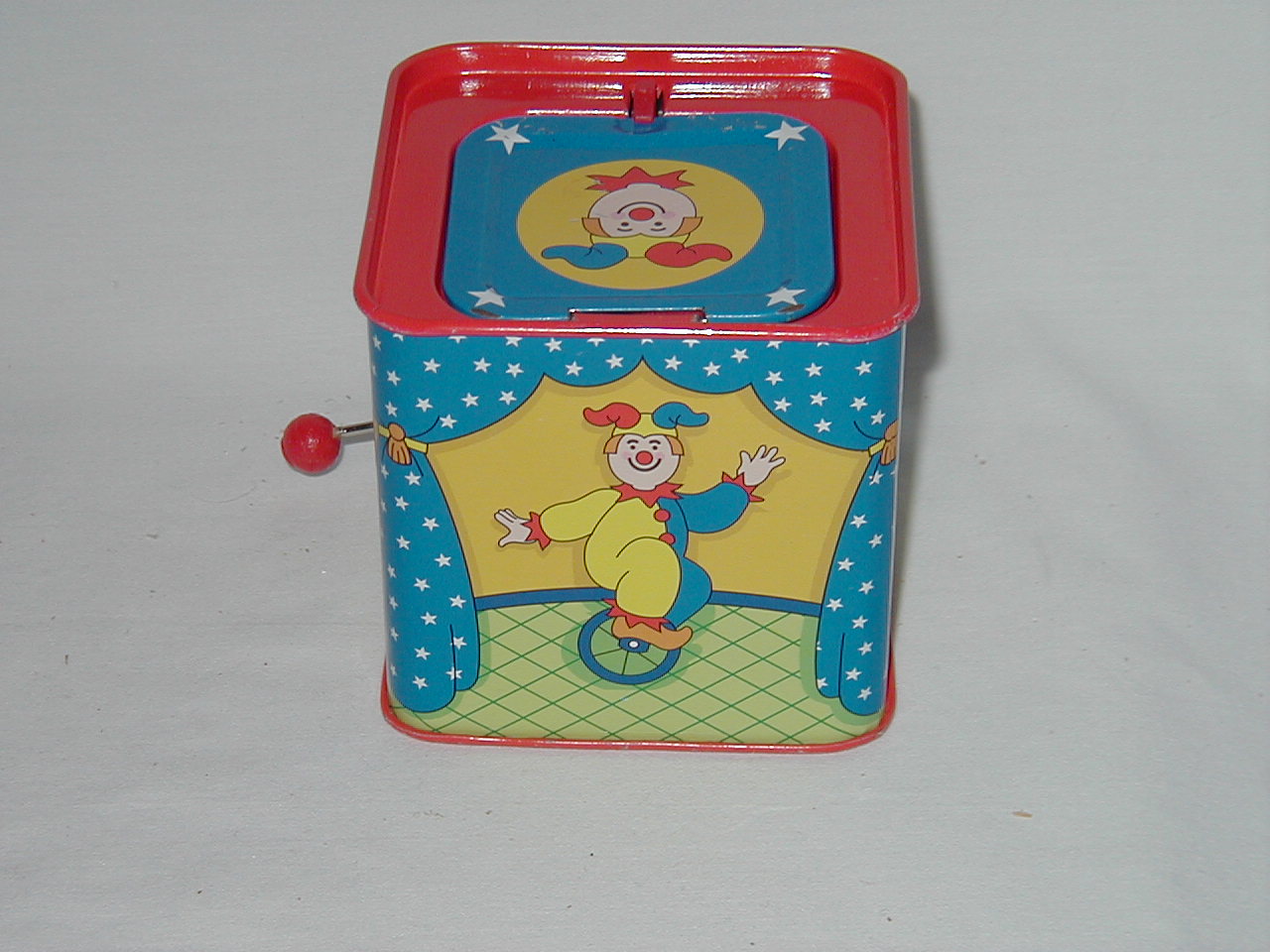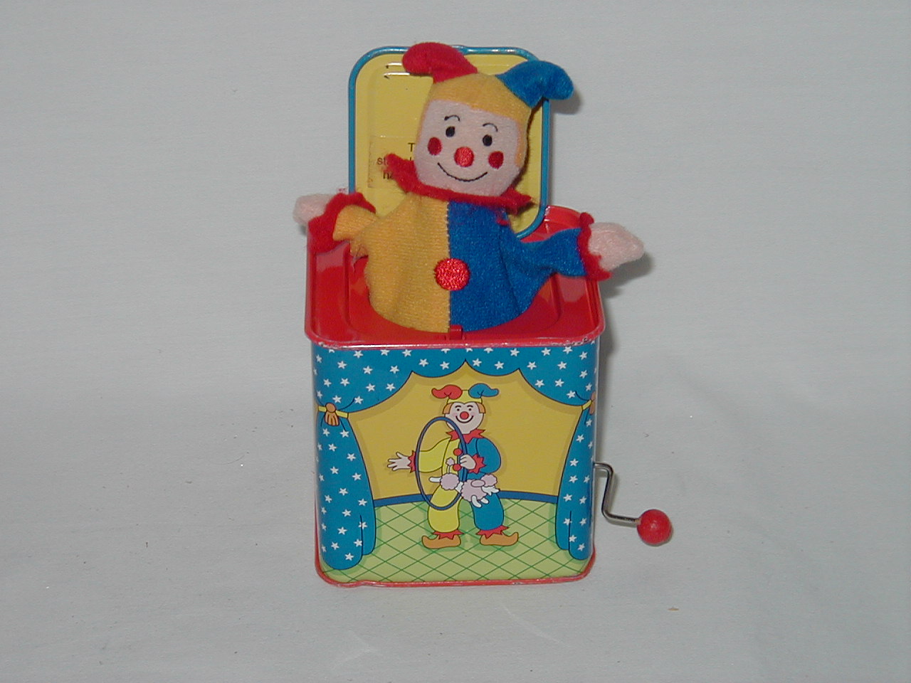 Jack -in -the -Box works. Turn handle, music plays, lid pops open after awhile. |