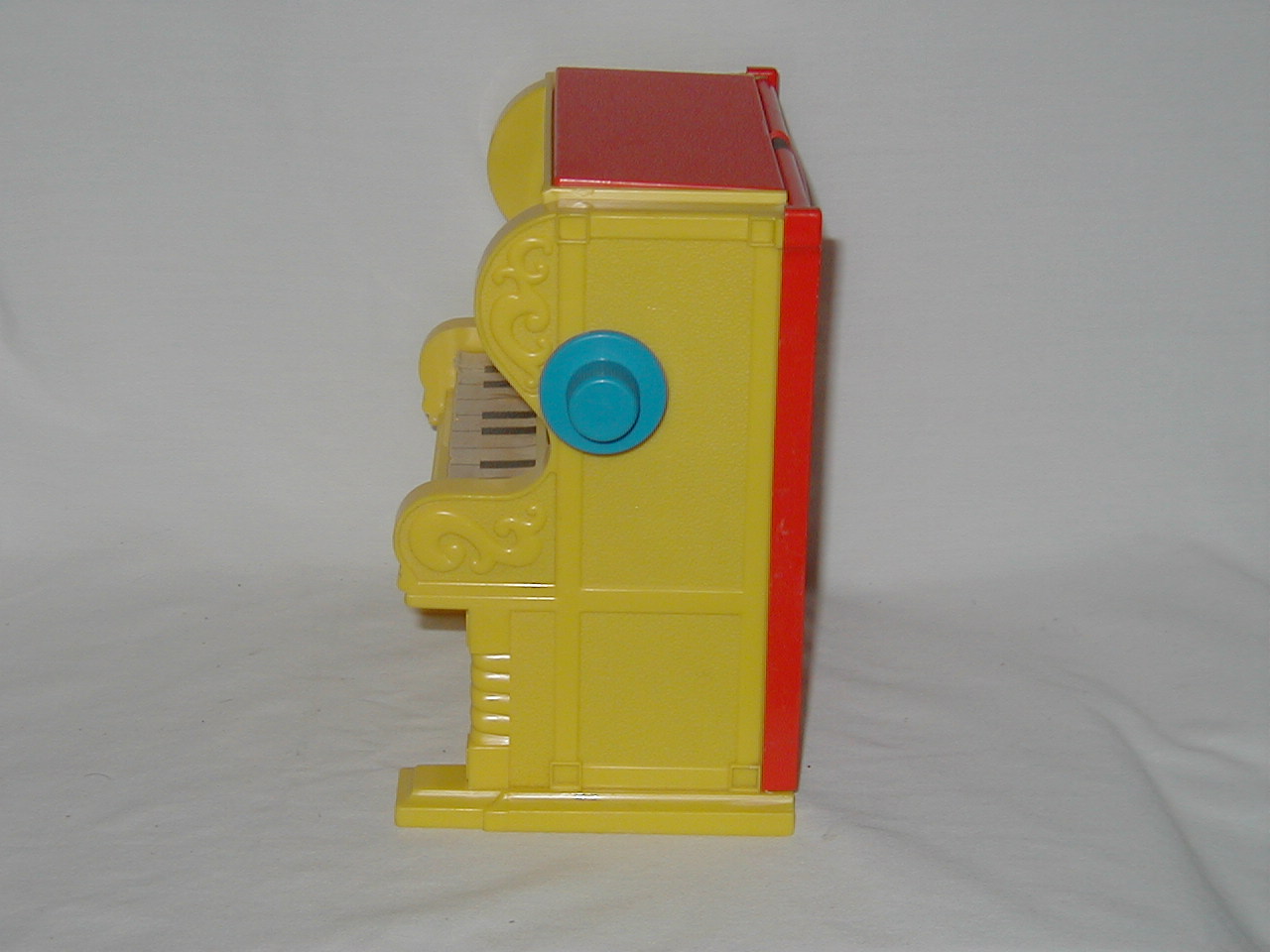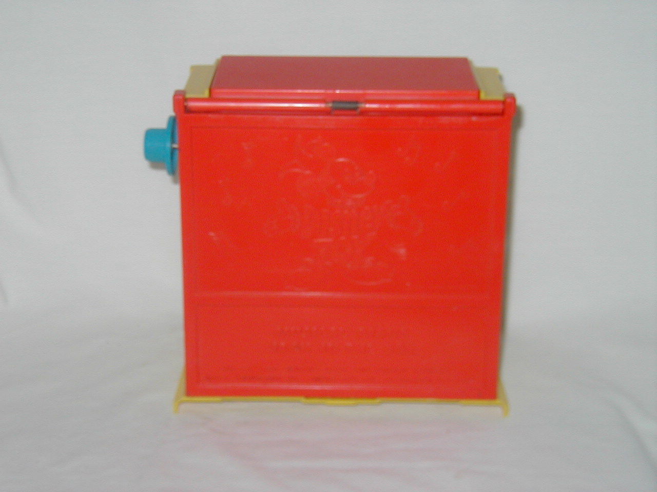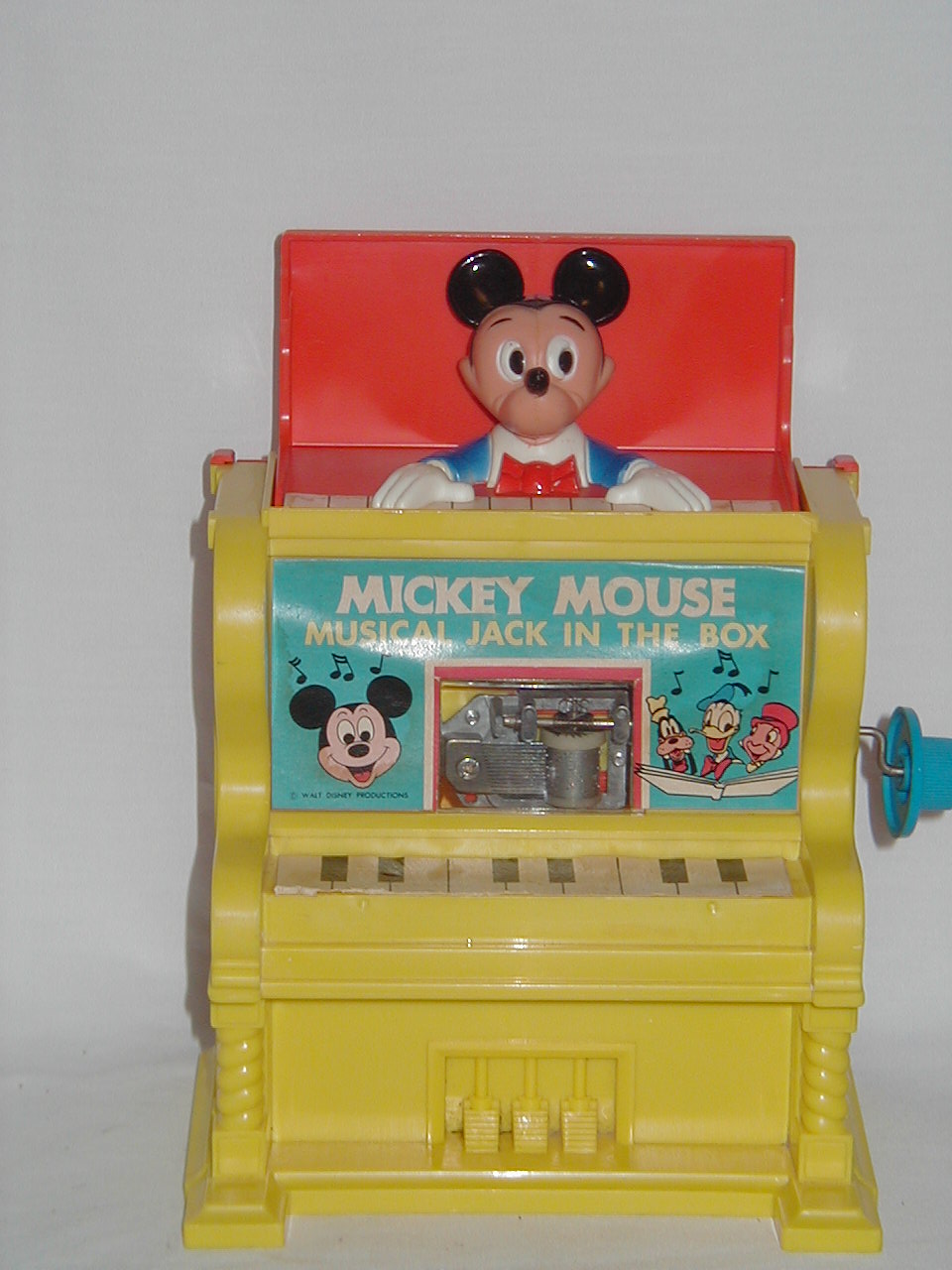 Mickey Mouse pops out of top after time of turning handle, while music plays. |