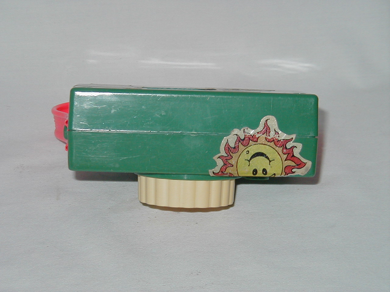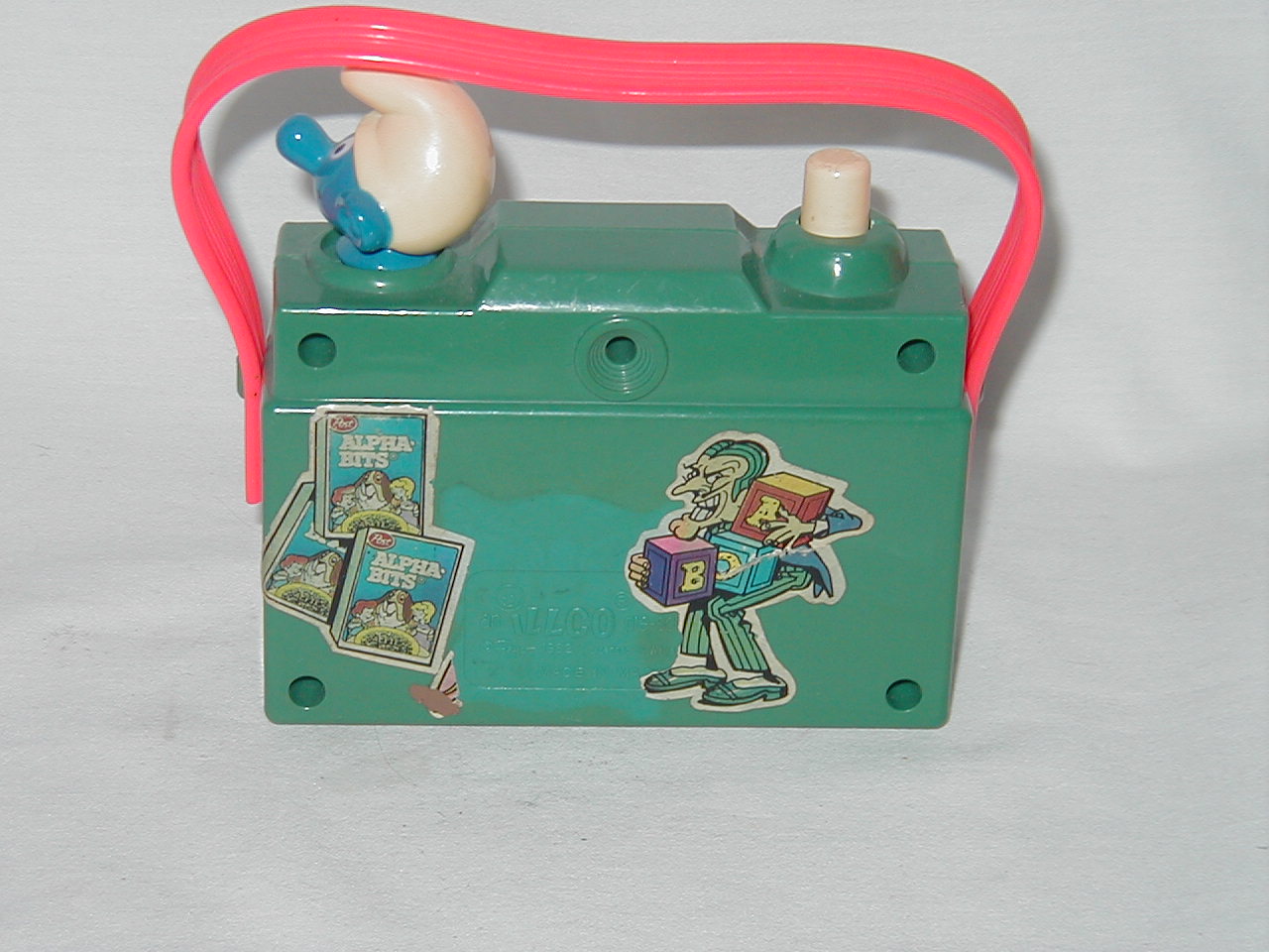 To start the music wind the viewfinder in front clockwise.. The smurfhead on top rotates with the music.. The white button on top left is the on/off switch. The paper designs around the body are, assumedly, not original, except for the one on the viewfinder and the two small ones in front top left and right.