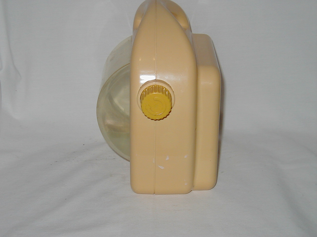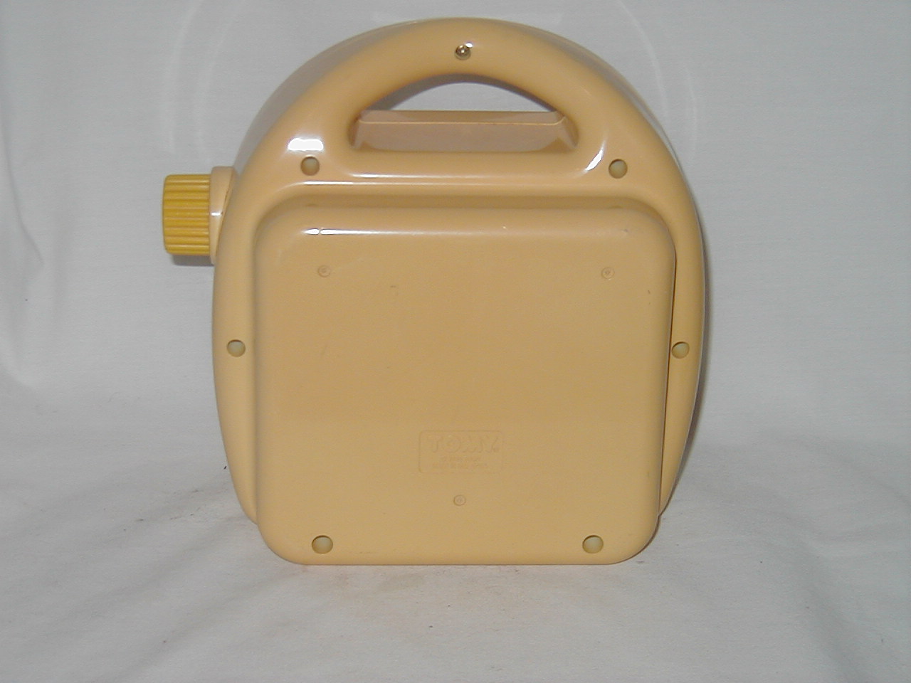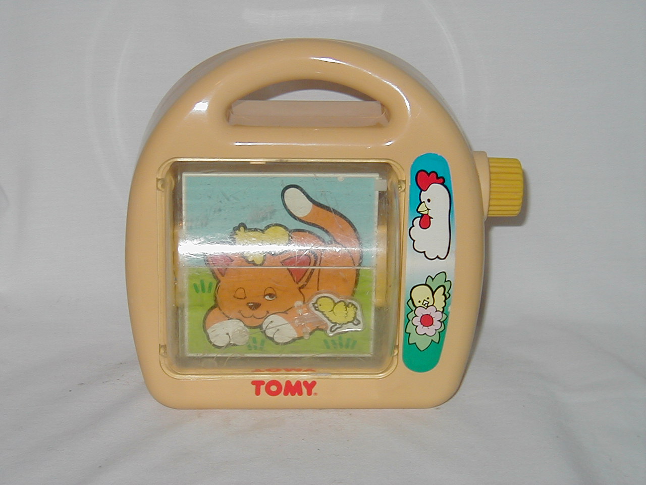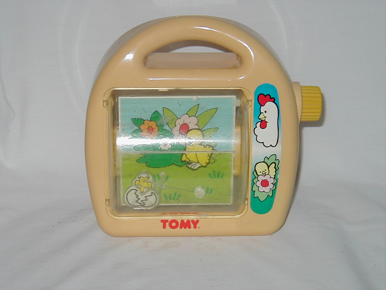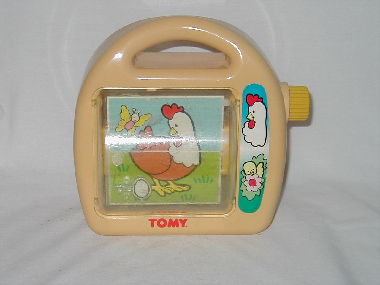 When the music plays, one of the top half panels inside the clear plastic window, rolls over, producing a different picture each time, 4 in total. Each scene has a separate loose set-in in the bottom, of a chiicklet, egg, etc, moving a bit by itself from the action of the roll-over. No on/off switch. Works very well.