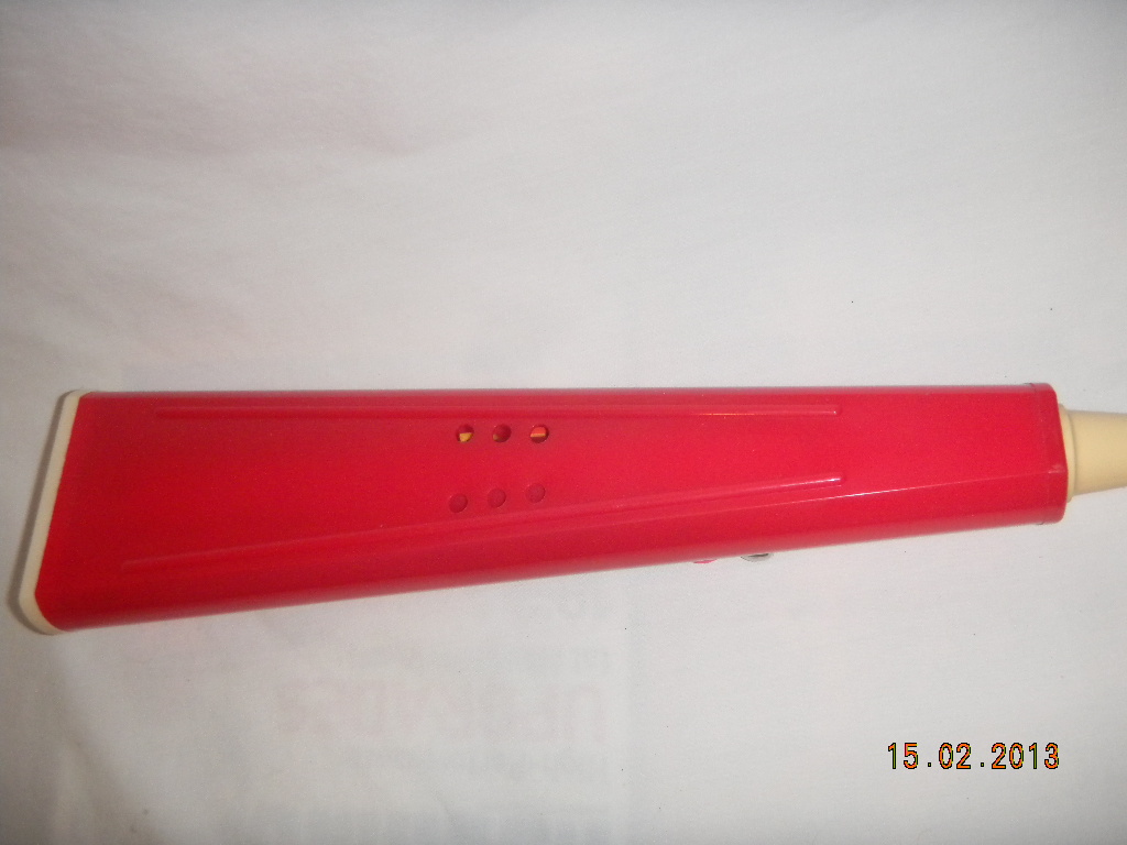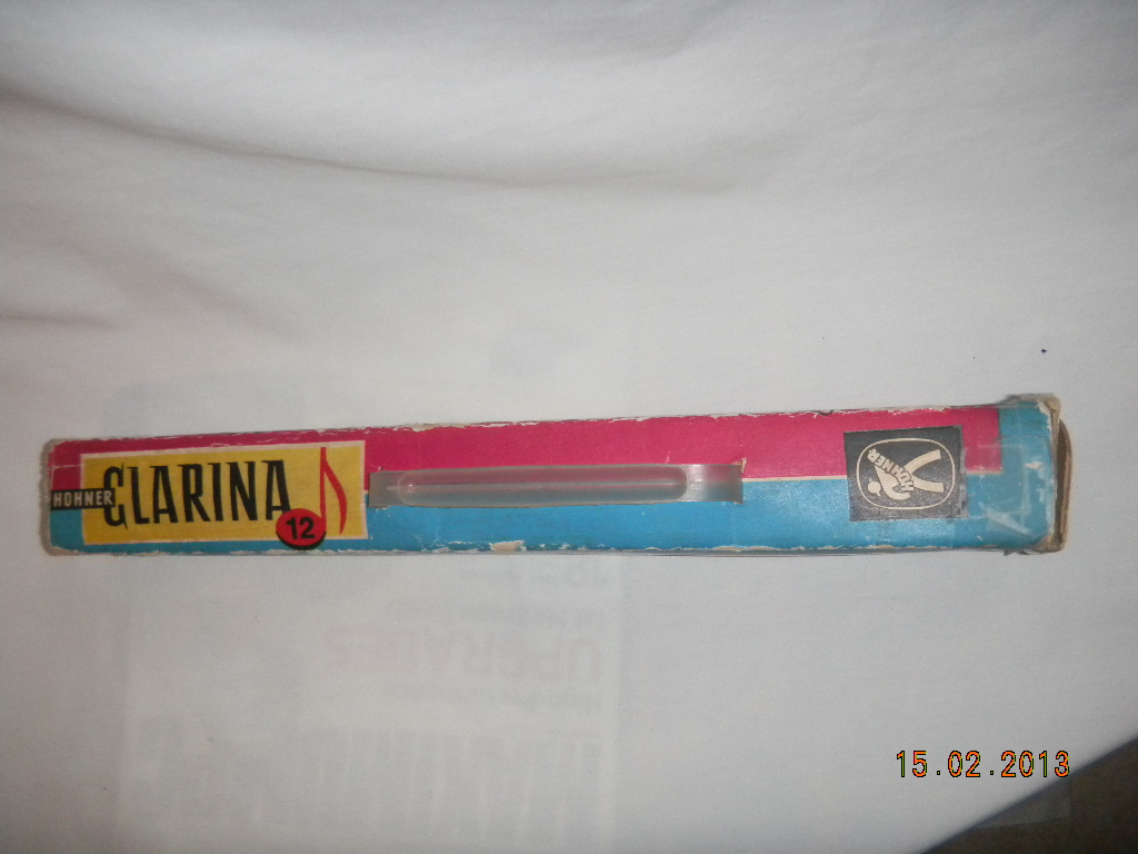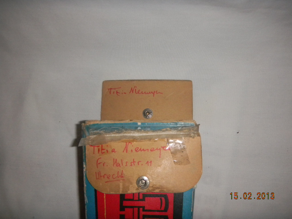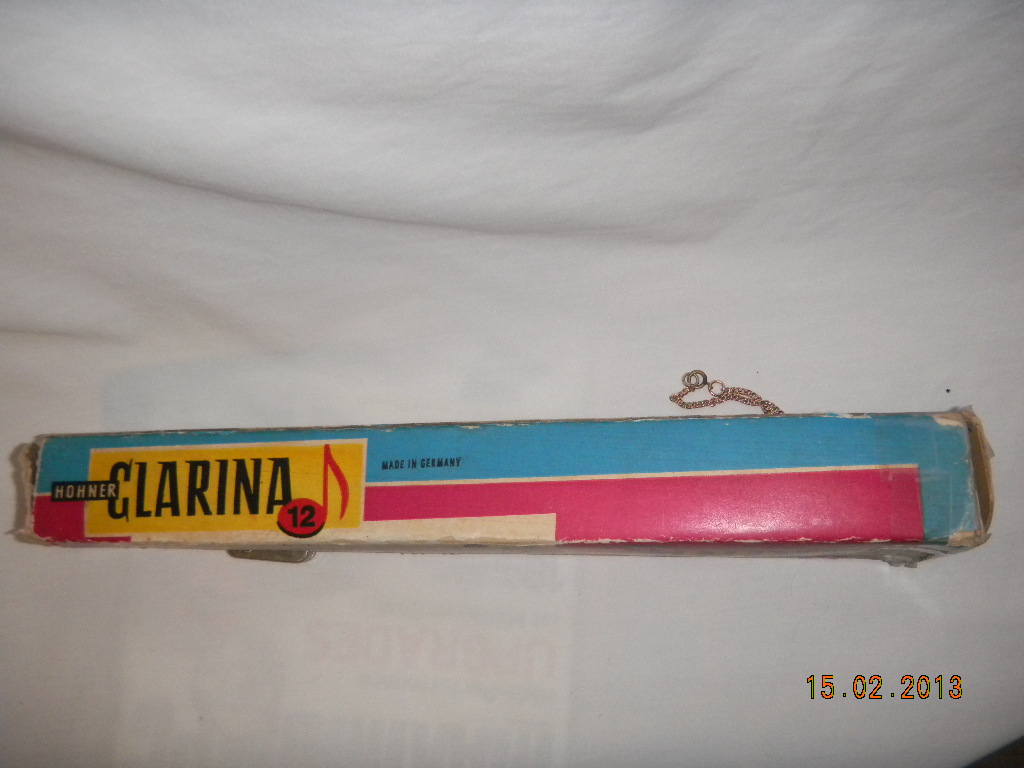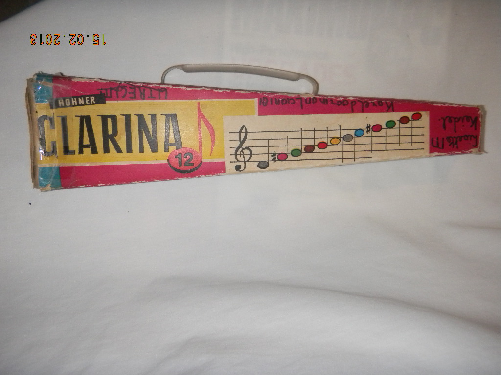 Box | Yes, cardboard, reasonable condition, with plastic handle. | Information on Box | See photo's | Est. Origin | x | Est. Year/Period | x | Music Mechanism housed in | Clarinet, not a  music mechanism | Distributor | x | On/Off Switch | No | Activate Music | Like a mouth organ. | Weight in Lbs | 0.5 (without box). | Moving Parts | No | Remarks on Condition | Good, all tones working. | Misc. Information | Two previous owners, Titia Niemeyer and Lisette M Keidel both of Utrecht, the Netherlands, have left their names and addresses in writing on the packaging. |