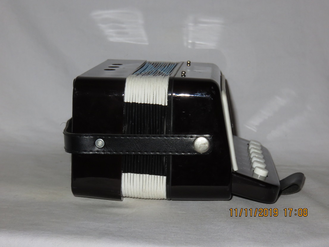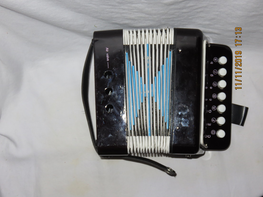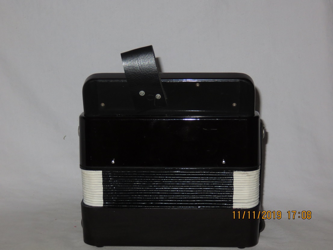 Closely resembles the Woodstock accordeon, same design, 7 tones 3 airs. same weight and dim's. No name or country or any otheridentification here. |