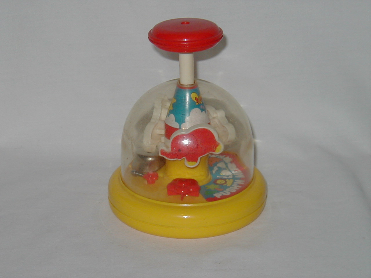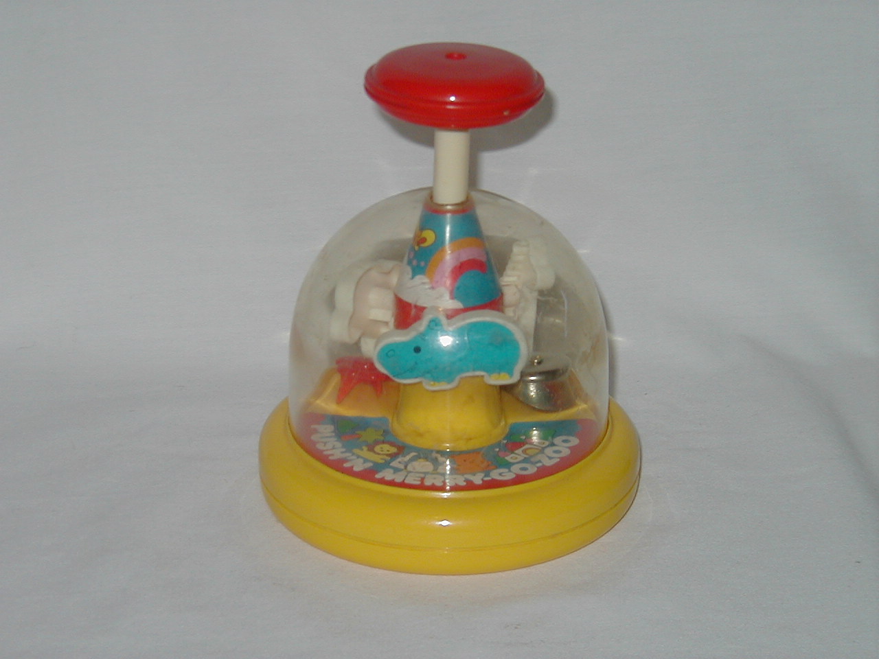 This is as a small spinning toy top. Push the top knob down and the 3 animals (giraffe, elephant and hippopotamus) on the carousel behind the clear cover will rotate, while a small hammer sounds the bell regularly. While rotating the animals move up and down.