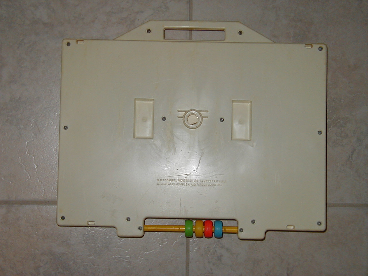 Other informatioin on back: 'Item No. 5398 DeLuxe Musical Busy Box. Questions or Comments call: 1-800-Playskl, 1-800-752-9755. CAUTION: To avoid head entrapment do not attach bottom of busy box to mesh-sided cribs or paypens." . Same injection mould as B 039 001, but all additions on top are different in design, though functionaly the same. After winding the yellow plastic knob in the front middle, music plays (tune not recognized) and the two wheels, blue and green, rotate. All the other activities are to be manually handed, moving, opening, ringing bell, toot horn, points hands of bear on clock,etc. The yellow plastic knob on right top front is only to rotate the wheel with colors and figures, no music.
