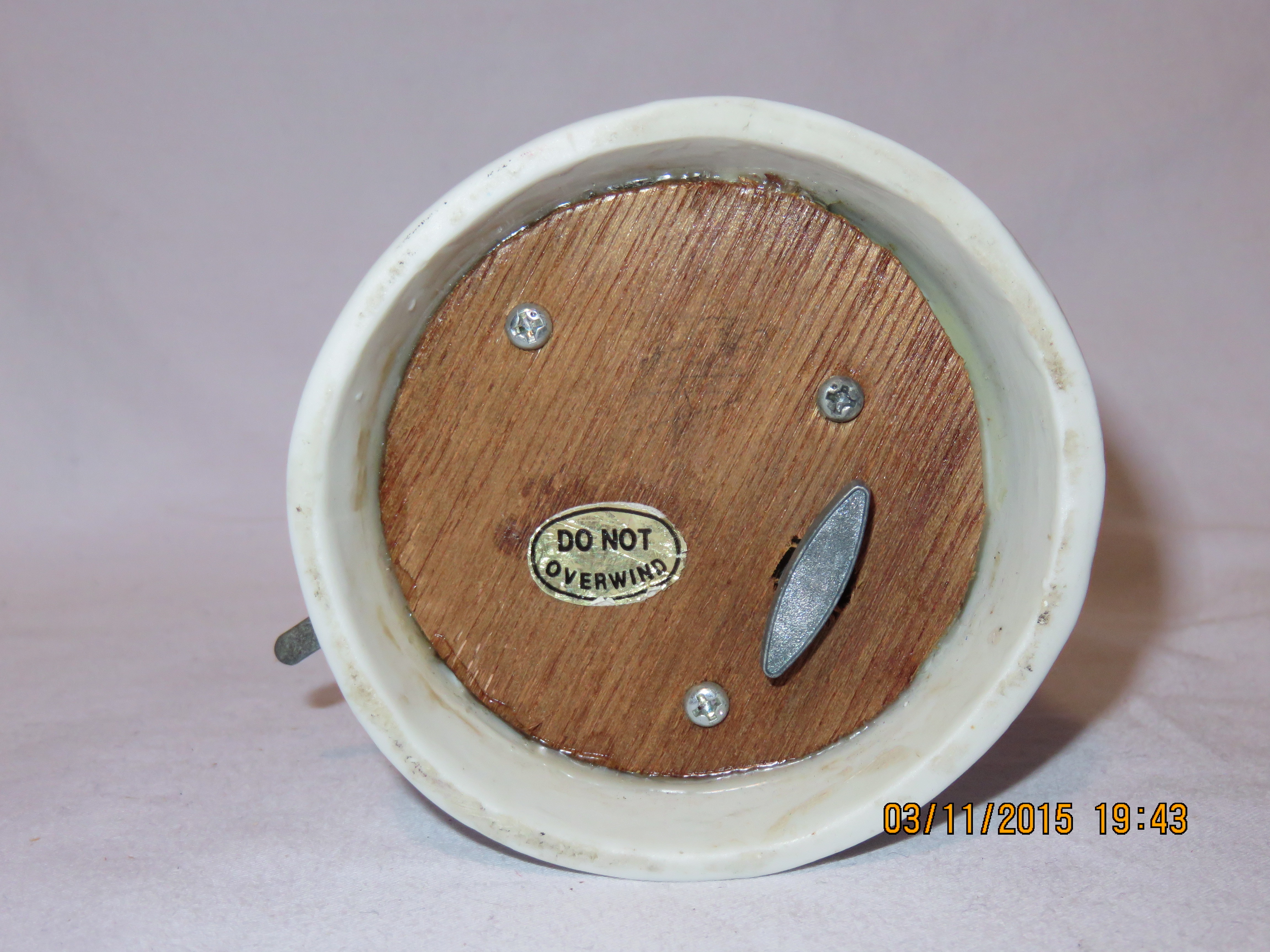 Good, figurine excellent. Previous owner seems to have worked on bottom cover and reglued. |