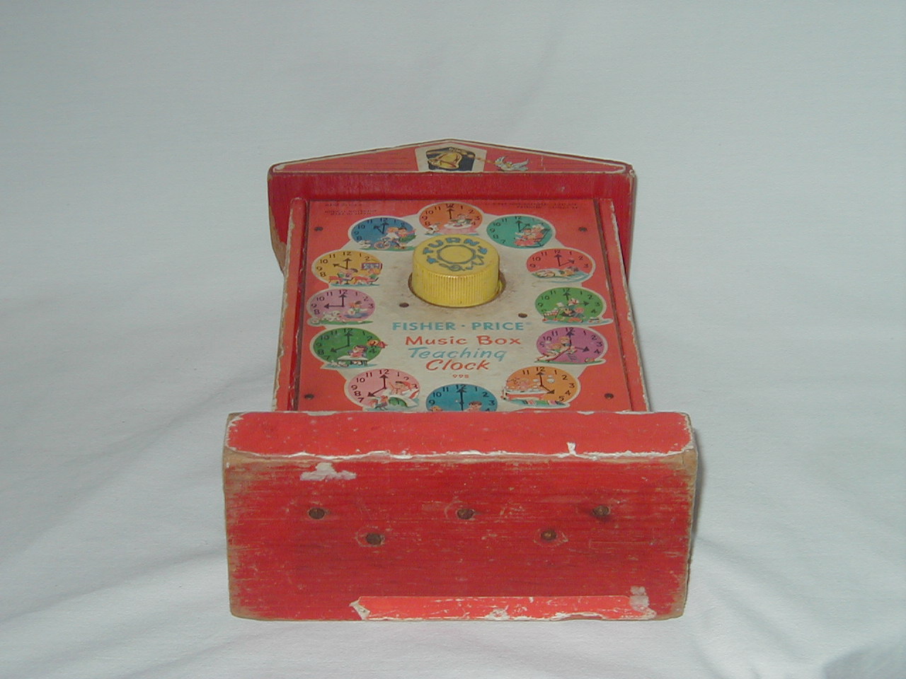 Other information on labels: 'Fisher-Price Music Box Teaching Clock.Fisher-Price Toys.School. Musical Movement made in Japan.Fisher-Price Toys, East Aurora, N.Y. U.S. Patents 3,114,216 3,247,614 Patented Canada '64. Music, apart from playing tune (not recognized) makes ticking noise, on purpose I presume. Both hands of clock can be set manually and independetly.